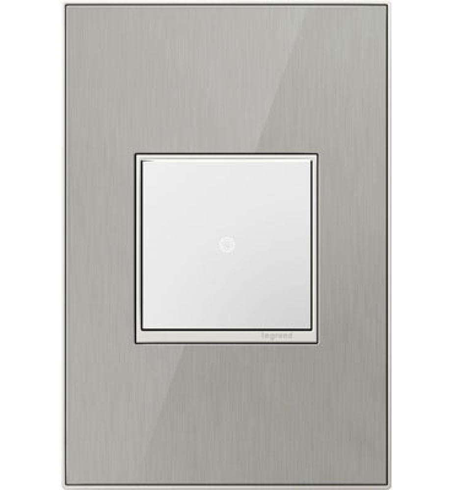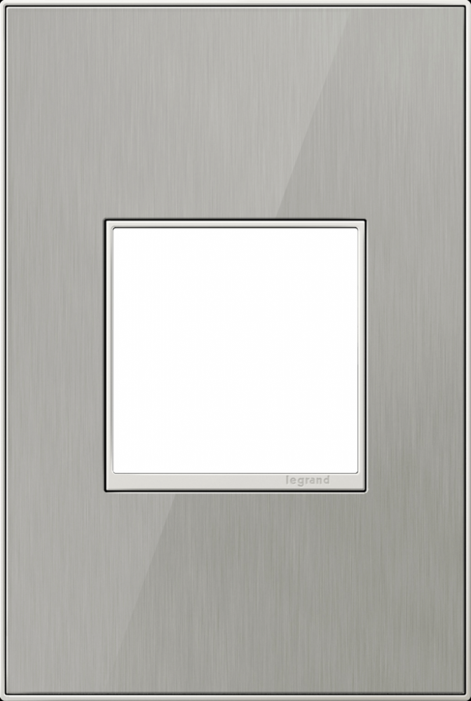 Stainless surface with satin nickel frame, for a trendy industrial touch that?s also sophisticated. A 1-Gang Wall Plate, it is perfectly sized to fit a standard-sized adorne device, or any combination of two half-sized adorne designer switches or outlets.