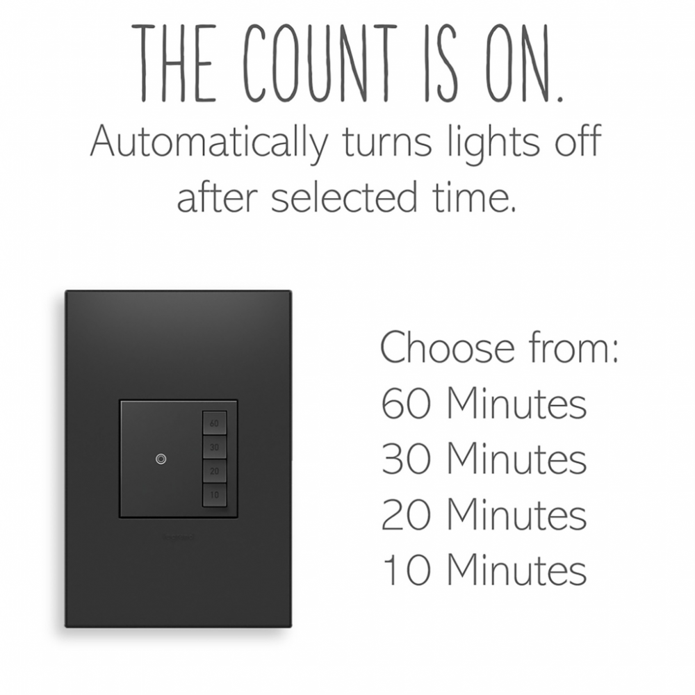 Great for places where you might often forget to the lights off, like bathrooms or basements. This timer light switch features Manual On/Timed Off control, so you can easily turn lights on when entering a room and then let yourself go worry-free. Just preset the timer switch to turn lights off automatically at a specific time, like after you leave for work or to take the kids to school.This switch* features enduring Microban? antimicrobial technology that works to reduce the growth of bacteria, around the clock, for the lifespan of the product.* Existing inventory of switches, dimmers and plastic wall plates from the adorne? Collection at some partner locations may not yet include Microban? protection. To confirm that a specific Legrand product is protected with Microban?, check that the exterior of the product packaging includes a green dot or a ""Protected with Microban"" label.Made exclusively for use with screwless Wall Plates from the adorne? Collection, sold separately.No antimicrobial efficacy claims are being made or are valid with respect to products sold in Canada.