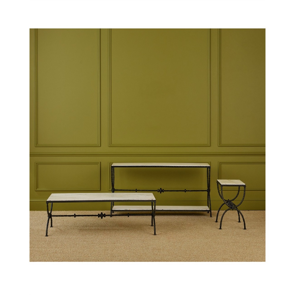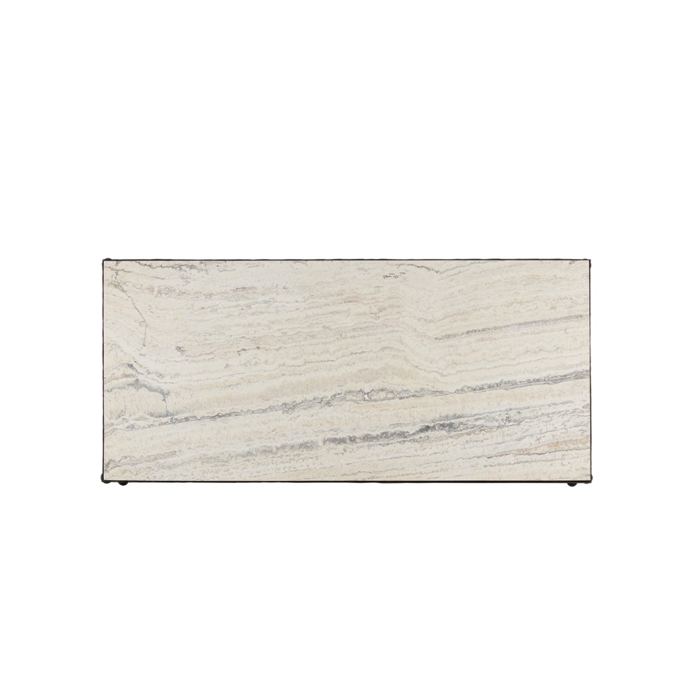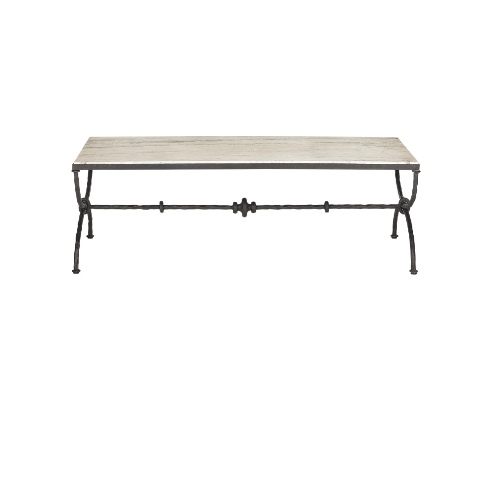 The Agora White Travertine Cocktail Table draws inspiration from classical Greek design. Its white travertine top has dynamic veining that adds natural texture to the piece. The hourglass-shaped legs give the table a sculptural presence, while a stretcher with decorative orb detailing adds an extra layer of interest. Finished in a rich bronze, the metal frame contrasts beautifully with the light color of the stone, which will vary from piece to piece.
