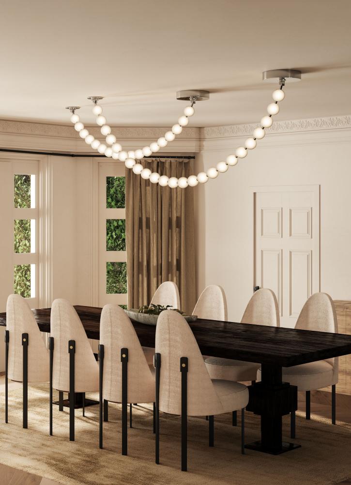 Inspired by the luxe pearls discovered by the sea, the Akoya collection is an instant classic. With unlimited amounts of configurations, this collection is perfect for any space in need of an awe-inspiring statement piece. Beads of illumination twirl in any way you prefer on a subtle frosted polished chrome frame. Now available in new sizes and canopy options.