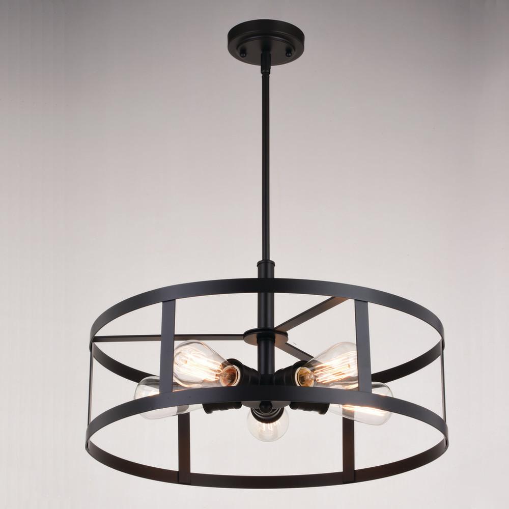 The modern soft industrial Akron collection has style and charm. A drum shape takes the stage in an oil rubbed bronze finish which surrounds the perfectly placed curving lamping, creating an ideal pairing. This 5-light pendant is perfect in any indoor space such as hallway, dining, or kitchen.