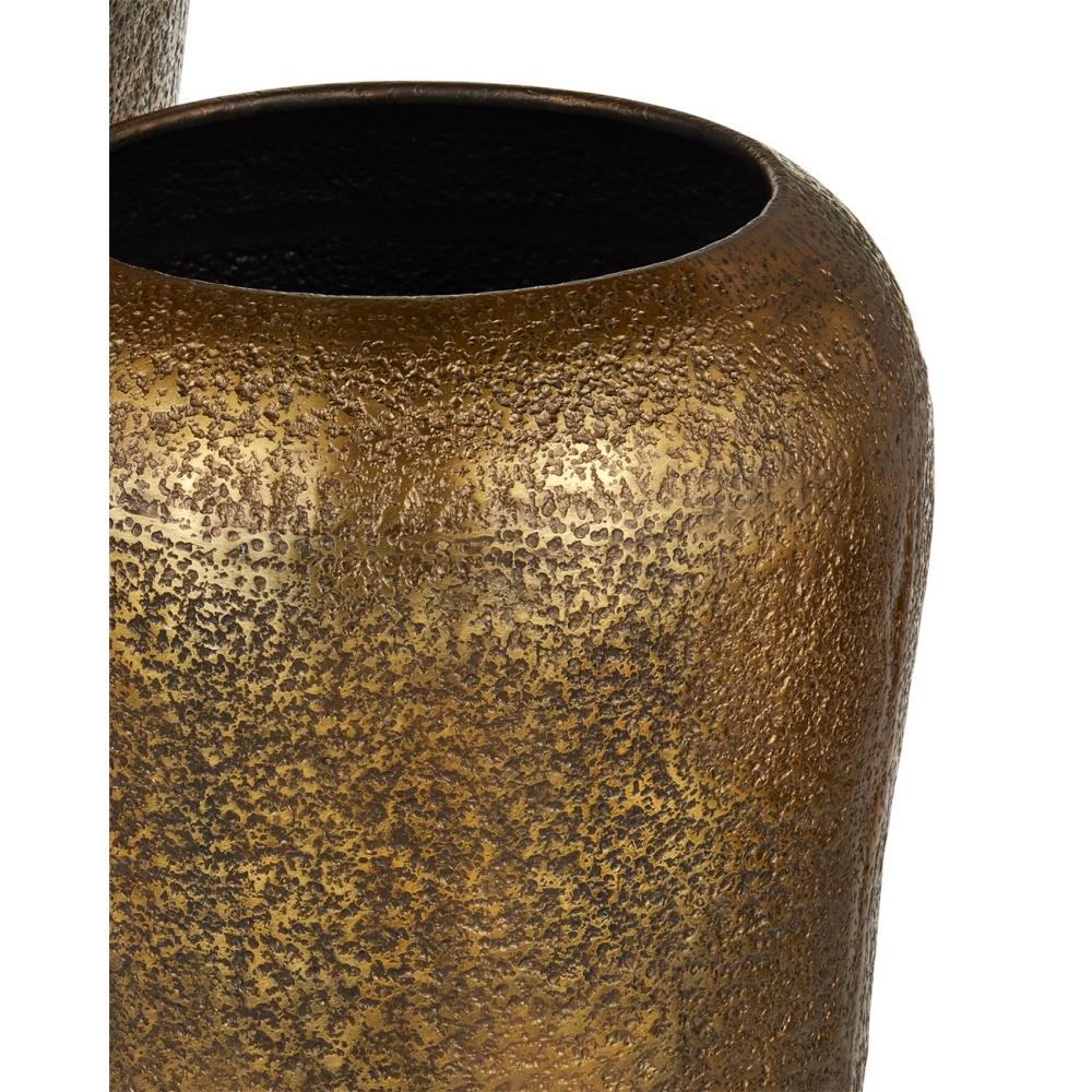 The Aladdin Vase Set includes two oversized vessels made of cast aluminum in an antique gold finish. The incredible amount of pitting on the surfaces combined with the drifts created when the finish gathers in crevices and is wiped away creates beautifully textured accents.