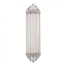 Fluted cast metalwork clasps Albion’s shimmering array of polished rods. The broad rods, beveled on each end, are arranged in tapering order before a frosted glass diffuser. Combining the bright light and energy efficiency of LED with the glamour of Art Deco style, Albion is a winning wall sconce or bath and vanity piece, sure to endure in both style and substance.
