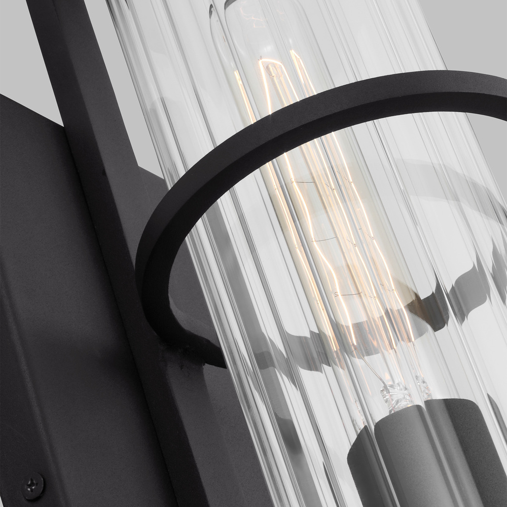 Clear fluted glass shades give the Alcona series a refined industrial look. The elegant square backplate and metal center ring provide a floating glass effect. The Alcona one light outdoor pendant fixture creates a warm and inviting welcome presentation for your home's exterior. Available in a handsome Black or Antique Bronze finish.