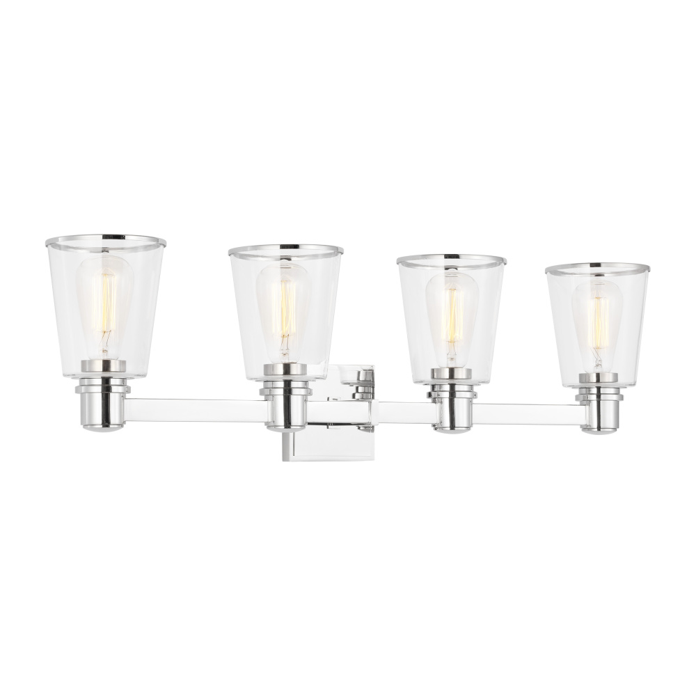 Designed by Chapman & Myers, the Alessa four light wall sconce in polished nickel is a Simple glass bathroom collection with rectangular metal arms and tapered clear glass shades. The conical clear glass shades replicate and frame the shape of the inner filament bulb. Each shade is supported by a rectangular metal arm and is capped with a thin metal rim.