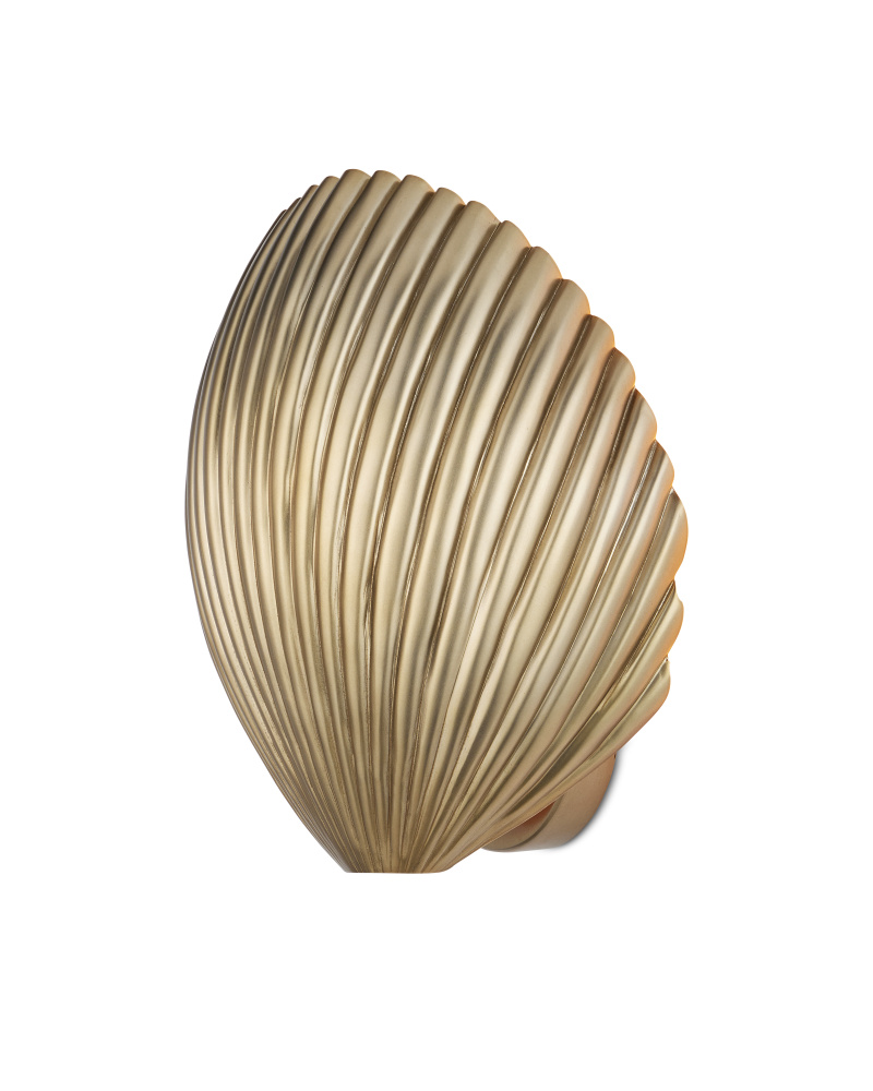 The Alexine Wall Sconce is a pretty shell-shaped gold sconce that washes a wall with splashes of light. Made of brass in an antique brass finish, the sconce has a single bulb.