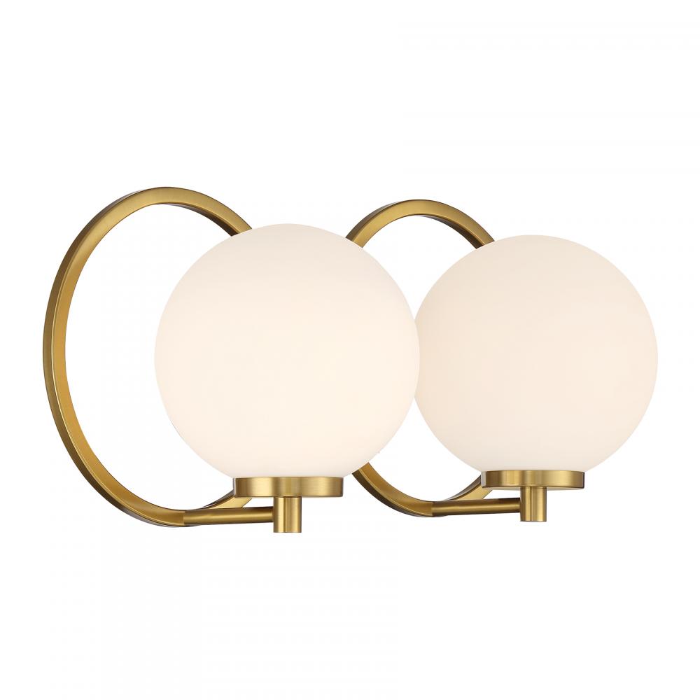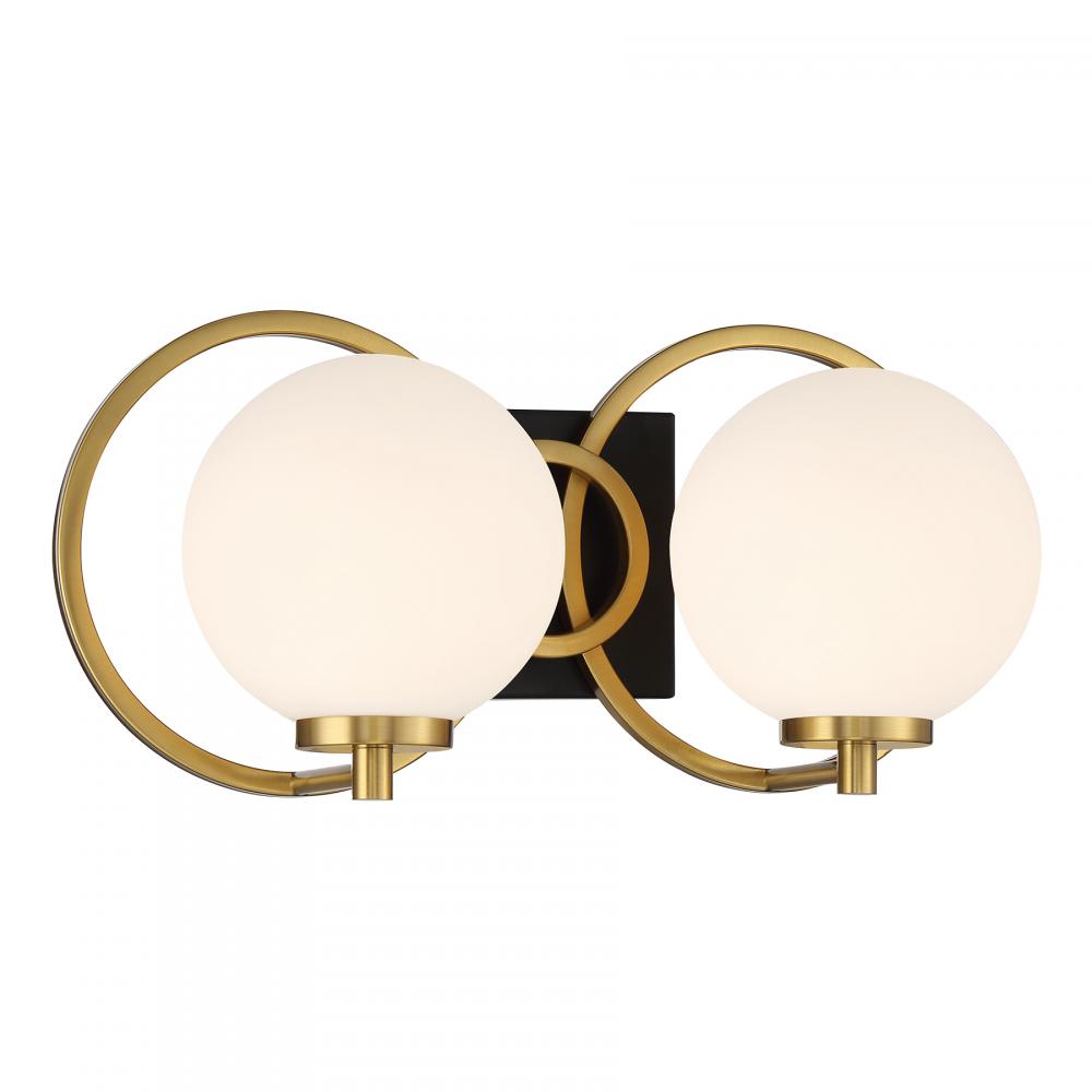 Art Deco style is reinvented in this chic Savoy House Alhambra 2-light bath bar. Orbs of soft frosted glass held on slender arms sit in front of a rectangular backplate accentuated by circles that frame the glass beautifully. A Matte Black and Warm Brass finish makes the perfect pairing. This bath bar is 7.75" in height, 16" in width and extends 7" from the wall. Uses two candelabra size bulbs of up to 60 watts per bulb. Bulbs not included. This bath light is damp area rated and must be installed as shown.