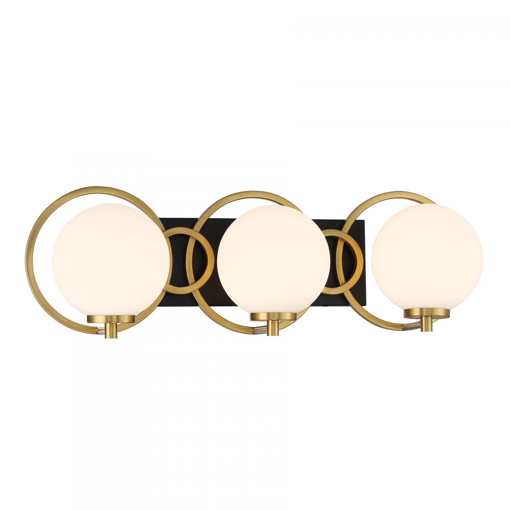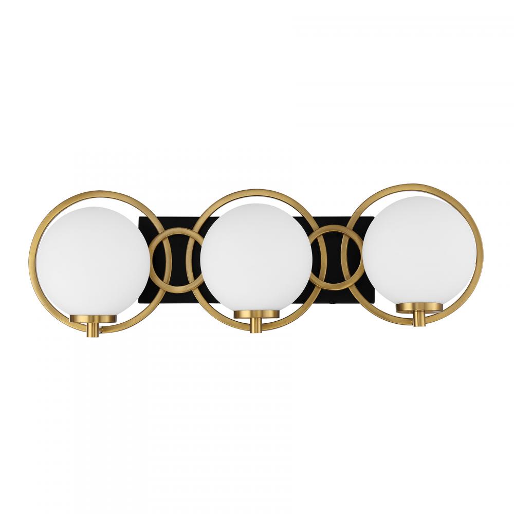 Art Deco style is reinvented in this chic Savoy House Alhambra 3-light bath bar. Orbs of soft frosted glass held on slender arms sit in front of a rectangular backplate accentuated by circles that frame the glass beautifully. A Matte Black and Warm Brass finish makes the perfect pairing. This bath bar is 7.75" in height, 24.5" in width and extends 7" from the wall. Uses three candelabra size bulbs of up to 60 watts per bulb. Bulbs not included. This bath light is damp area rated and must be installed as shown.