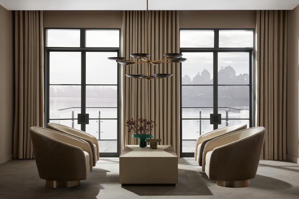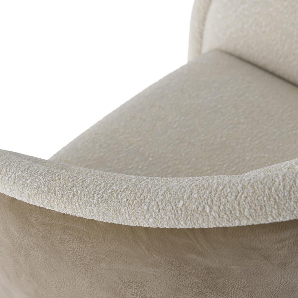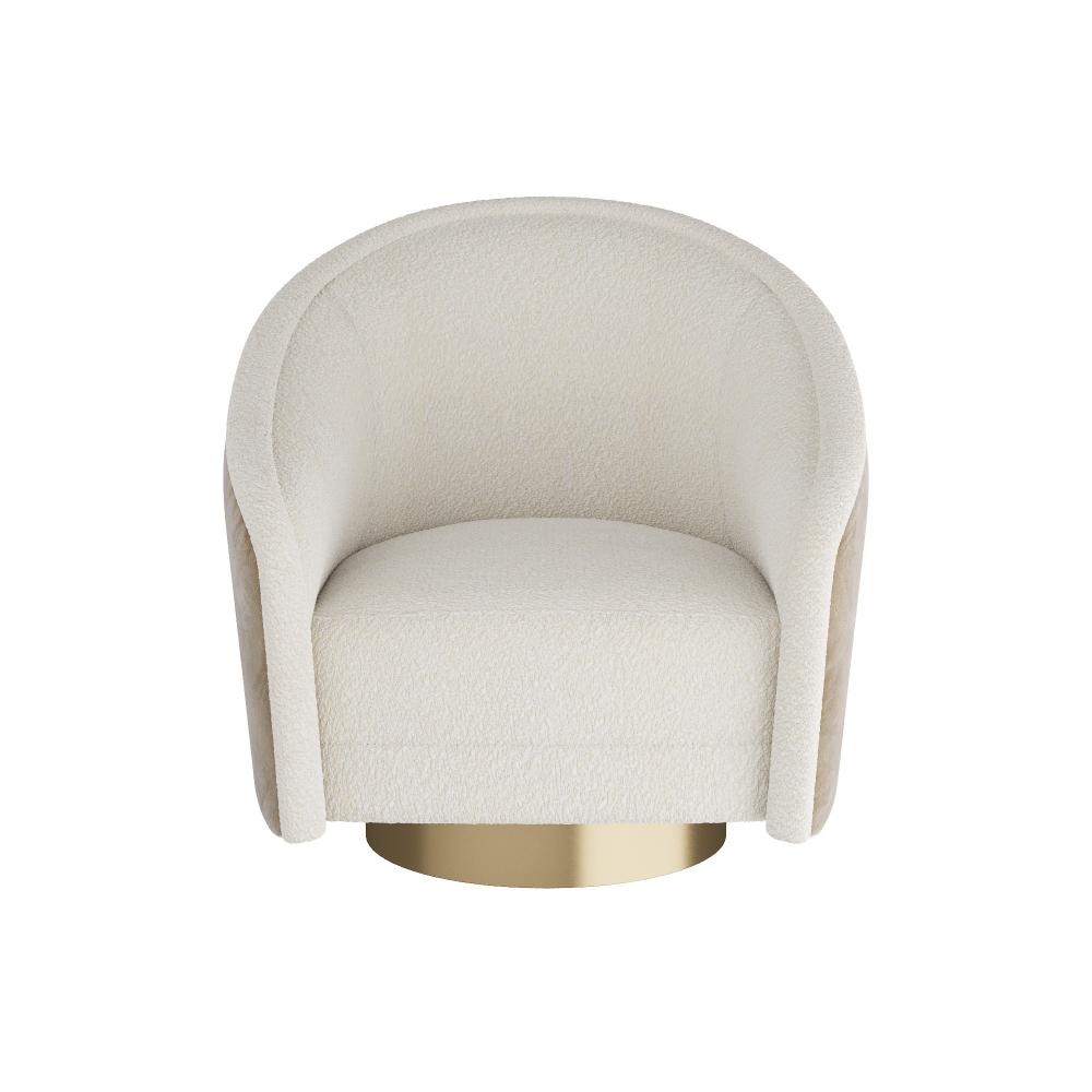 This cream sherpa design is designed to cradle like a hug, providing welcoming comfort to any room. A fully upholstered barrel is wrapped with luxurious oyster leather about the sides and back for textural interest. A recessed champagne finished plinth iron base anchors the chair while concealing a 360-degree swivel mechanism. Leather will vary.