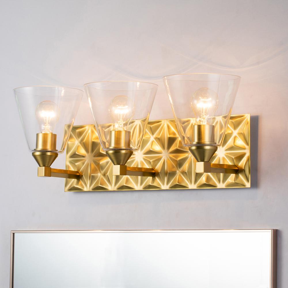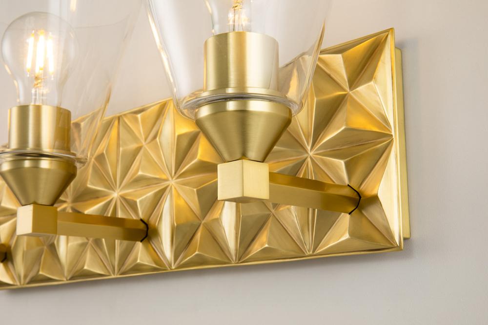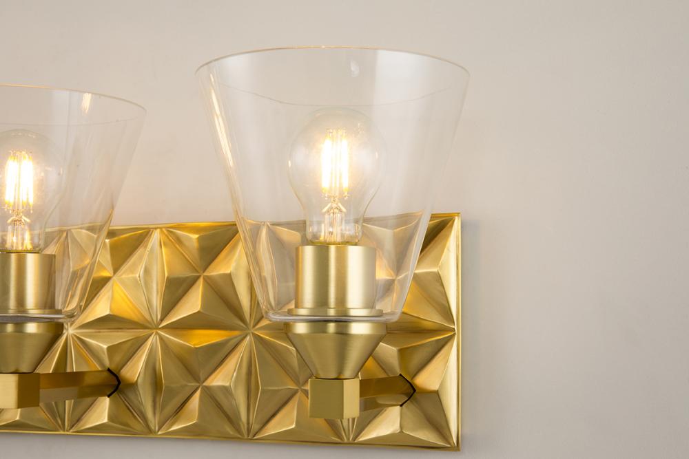 A 24.5" textured rectangle backplate sconce in aged brass with three cone-shaped clear shades. Mounts up or down, adding modern texture and design to any space.