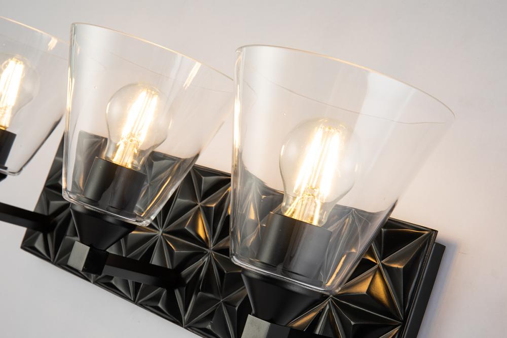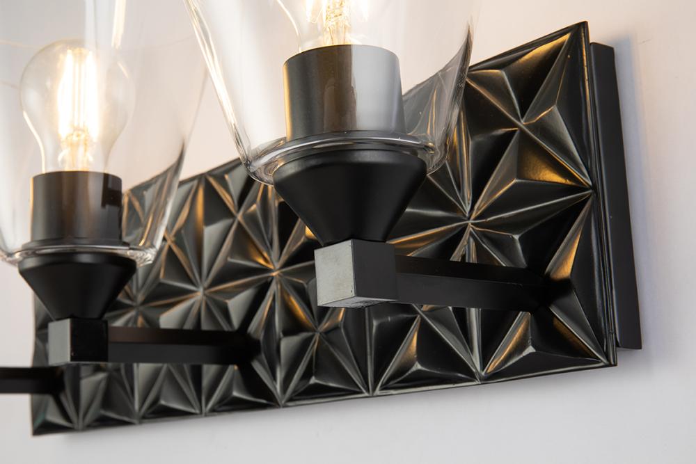 A 24.5" textured rectangle backplate sconce in matte black with three cone-shaped clear shades. Mounts up or down, blending modern texture and design for any room.