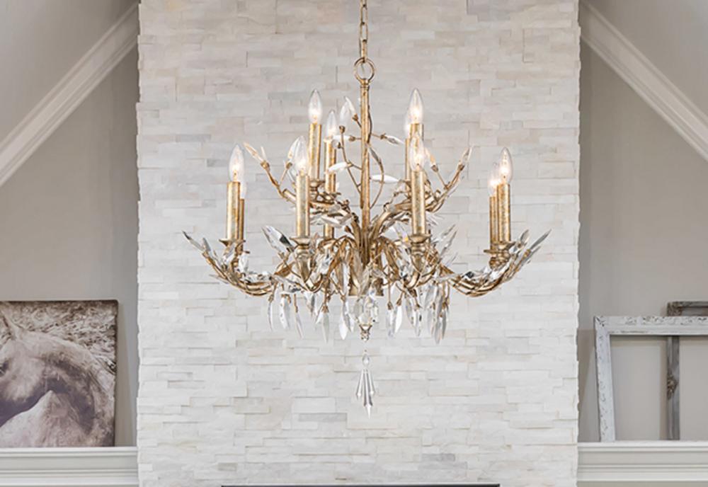 Inspired by flowering vines, this elegant 12-light crystal chandelier by Lucas McKearn in distressed champagne and silver with antique glaze suits dining rooms or bathrooms. Its curved frame and hand-cut crystals add glamour.