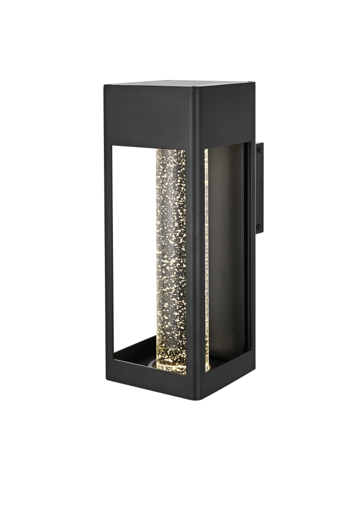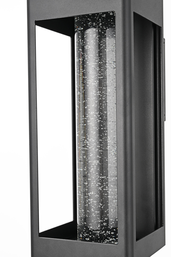 Designed with a strong geometric frame, this LED wall sconce adds structure and definition to outdoor spaces. The rectangular black metal body encloses a thick 2.5-inch clear seedy glass cylinder, which enhances the light diffusion while maintaining a crisp, modern glow. Built for durability, the iron and aluminum frame ensures long-term performance, while the ETL Wet Rated certification makes it a reliable choice for entryways, patios, and exterior walls. The compact 5”L x 1”W x 5”H backplate allows for a secure and streamlined mount, and the 7-inch pre-wired lead simplifies installation. Featuring an integrated 11W LED, this fixture emits a warm 3000K light at 300 lumens, with a 120-degree beam angle and 90 CRI for balanced illumination. Dimmable and hardwired for stability, this sconce combines precision and functionality for contemporary exteriors. Available in multiple sizes from 10” to 32”, this fixture provides flexibility for different architectural styles and placements. Built with marine-grade, corrosion-resistant aluminum, this sconce withstands coastal conditions for long-lasting durability.