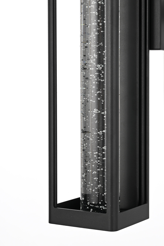Designed with a strong geometric frame, this LED wall sconce adds structure and definition to outdoor spaces. The rectangular black metal body encloses a thick 2-inch clear seedy glass cylinder, which enhances the light diffusion while maintaining a crisp, modern glow. Built for durability, the iron and aluminum frame ensures long-term performance, while the ETL Wet Rated certification makes it a reliable choice for entryways, patios, and exterior walls. The compact 5”L x 1”W x 5”H backplate allows for a secure and streamlined mount, and the 7-inch pre-wired lead simplifies installation. Featuring an integrated 11W LED, this fixture emits a warm 3000K light at 400 lumens, with a 120-degree beam angle and 90 CRI for balanced illumination. Dimmable and hardwired for stability, this sconce combines precision and functionality for contemporary exteriors. Available in multiple sizes from 10” to 32”, this fixture provides flexibility for different architectural styles and placements. Built with marine-grade, corrosion-resistant aluminum, this sconce withstands coastal conditions for long-lasting durability.