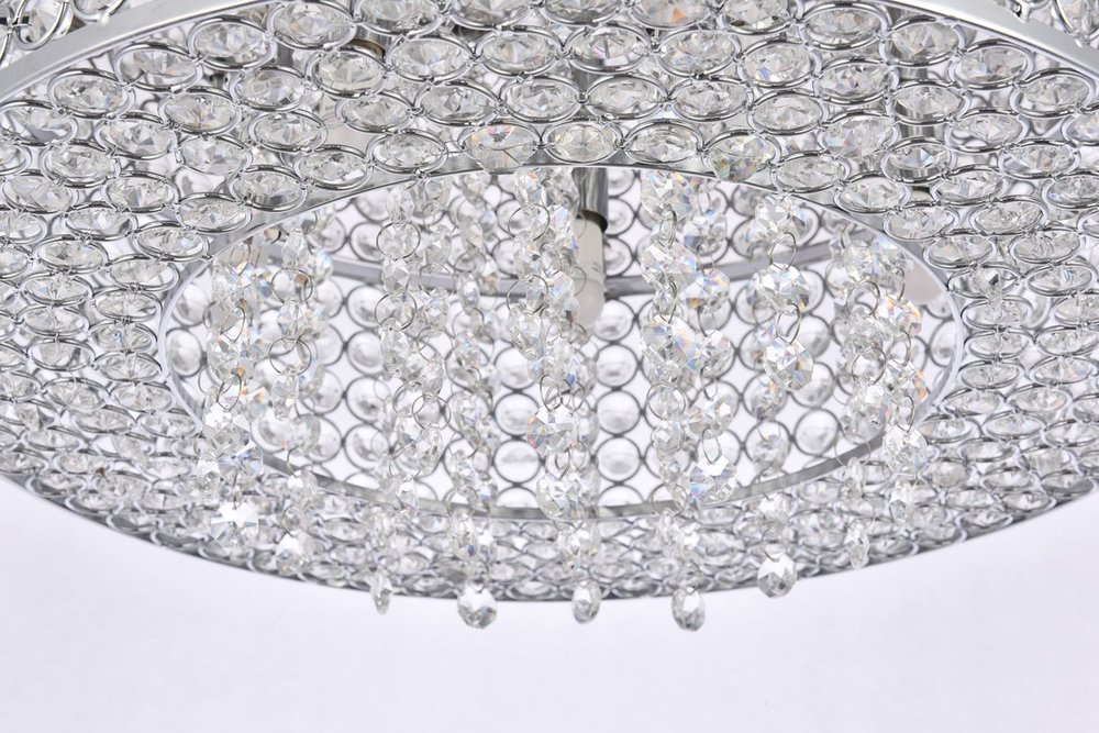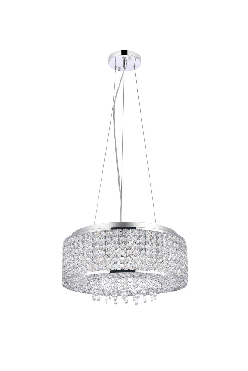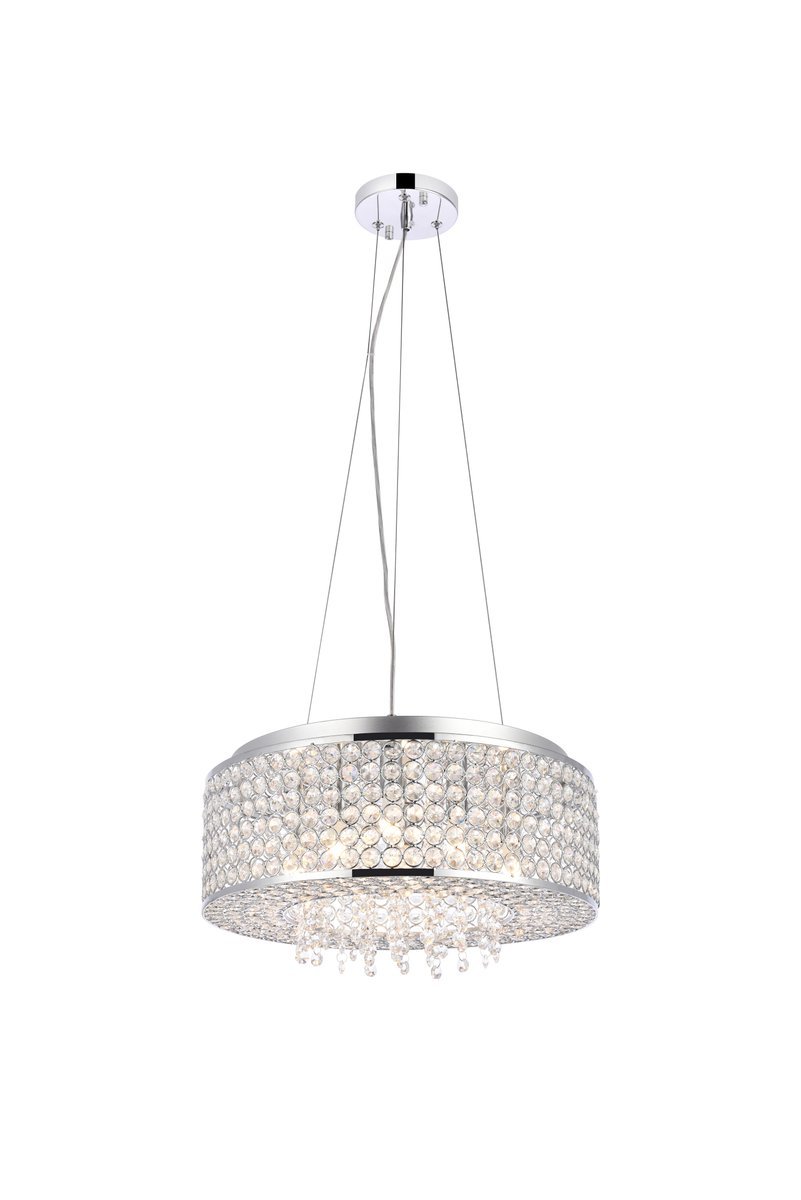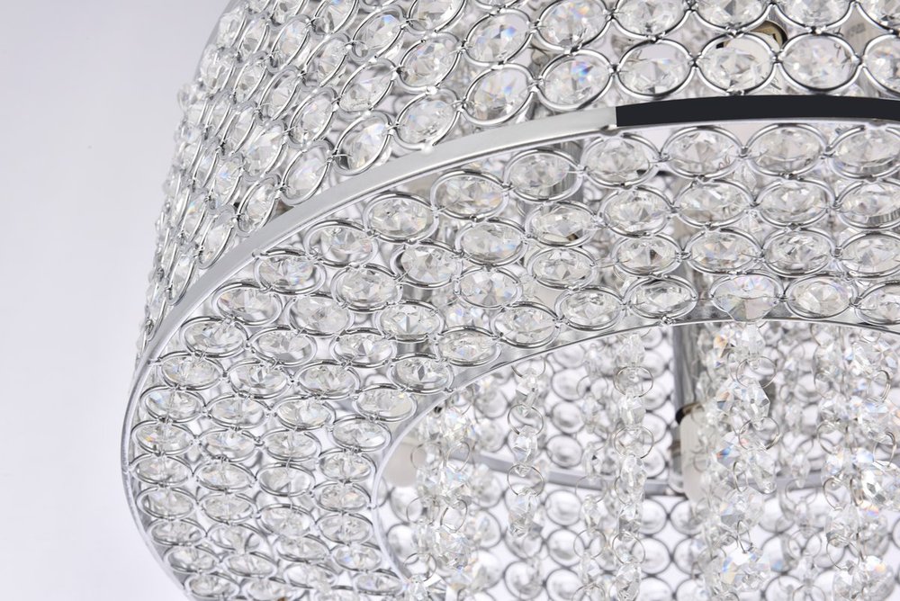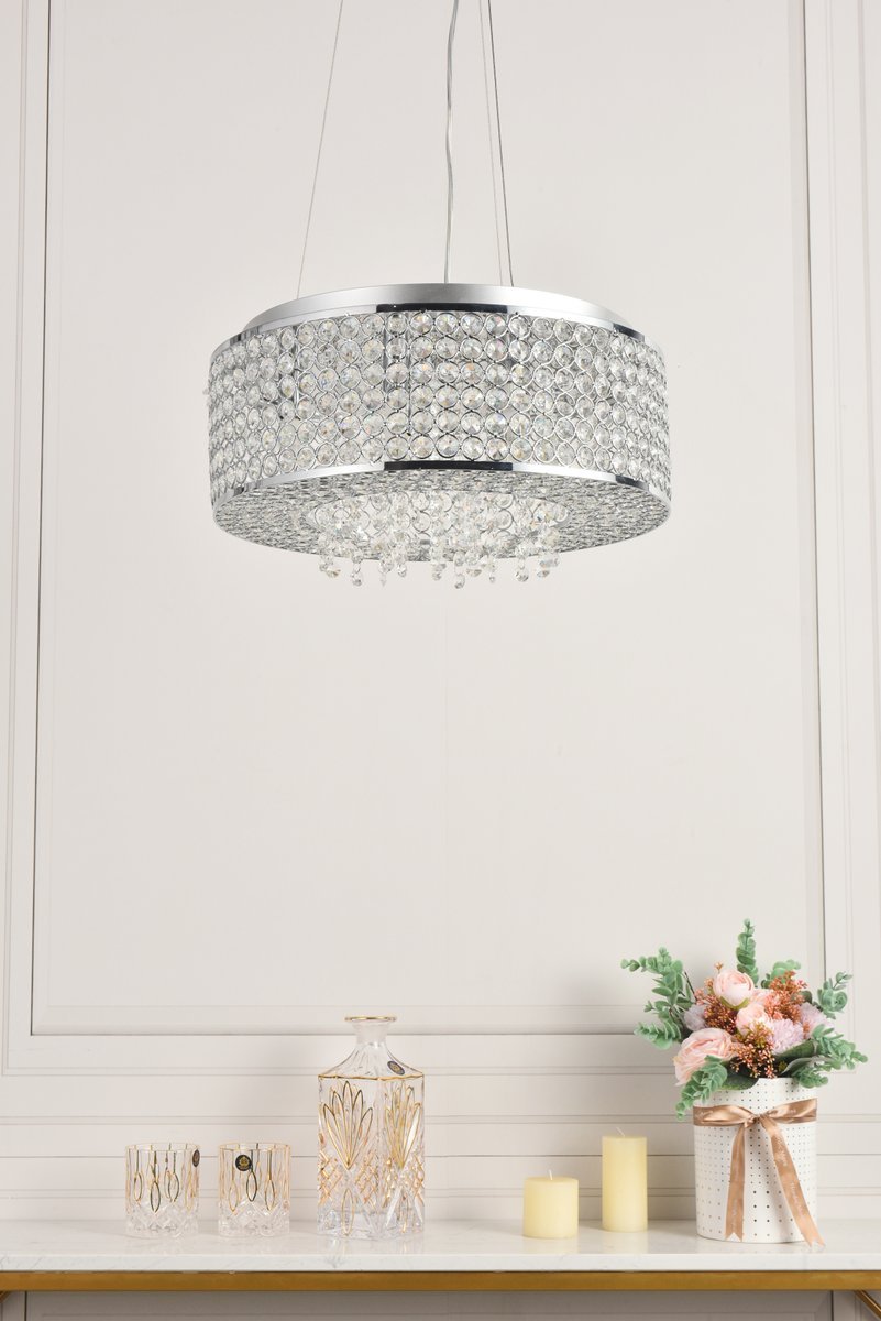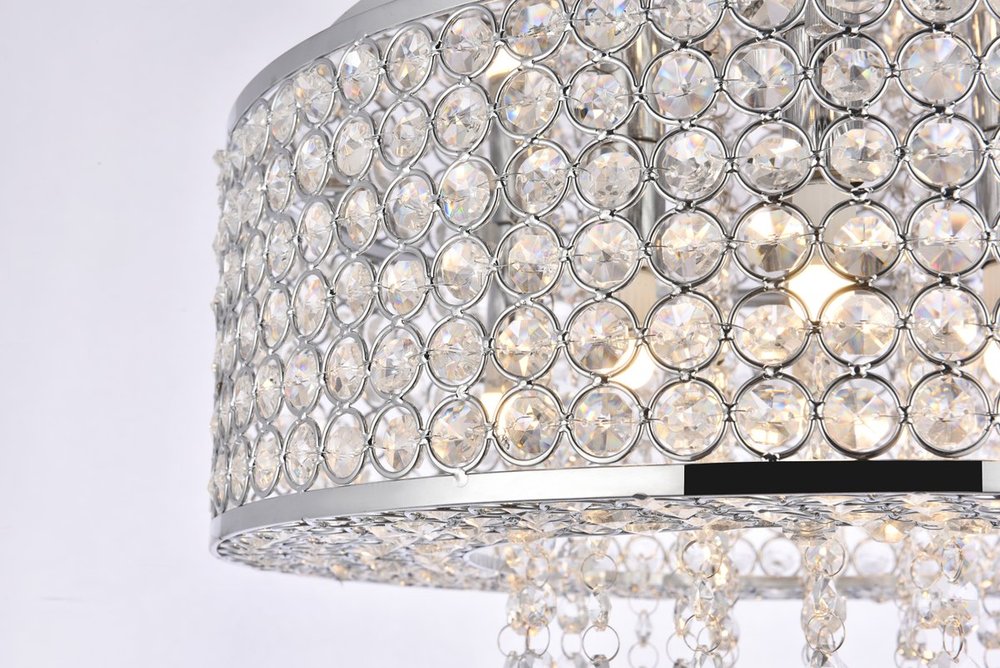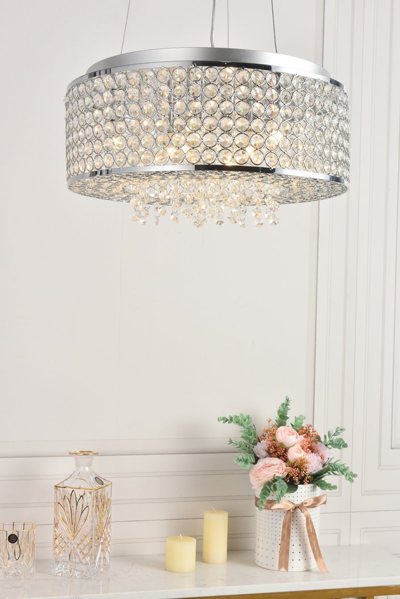 Like a brilliant shining star, the Amelie collection of hanging fixtures emits dazzling light from a bejeweled circular band, accented with gleaming strands of royal-cut crystals pouring through the open center. This chrome-finished ring surrounds four to 10 lights (not included) that highlight the intricate pattern of miniature circles that embellish the sides and bottom of the frame. in natural light, or with electricity, this sparkling hanging light would become a stunning showpiece for your space.