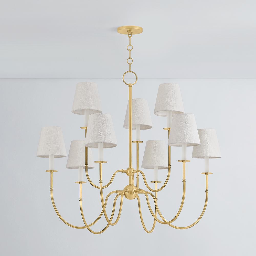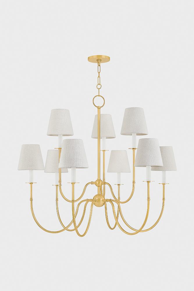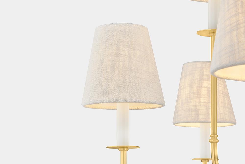 Vintage meets modern in the Amina family. Traditional Victorian metalwork details, including wide bobeches, are paired with contemporary candle sleeves and short white linen shades. Finished in Aged Brass, the slender, elongated J-arms feature a dramatic swoop. Whether as a sconce or 5 or 9-light chandelier, Amina provides a fresh update to traditional forms.