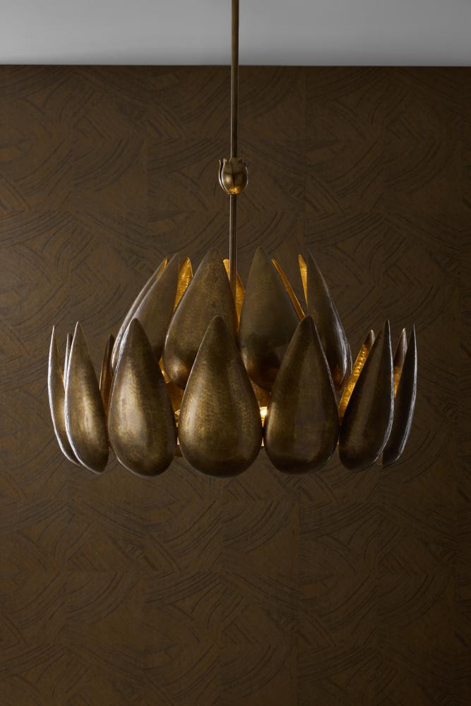 This hammered chandelier of vintage brass is both bold and Brutalist in form. Two layers of Lotus petals suspended from a sturdy support encircle a frosted acrylic diffuser, allowing just the right amount of light to peek through for illumination. A vintage brass floral finial provides an extra detail on the centered pipe. Damp-rated, although limited covered outdoor conditions may affect finish. Finish will vary.