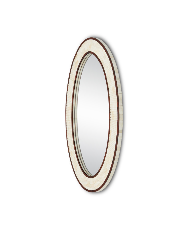 The Andar Oval Mirror has a beautiful ellipse shape. Bringing the dark brown and ivory decorative mirror a feel of tailored sophistication are the slight tonal variations of the cream-colored bone and the striations created when the pieces of the natural material are placed onto the frame in a way that there is ribbing on the surface. A thin wood edge in a dark walnut finish envelops the bone, extending around to both the interior and exterior edges of the Andar.