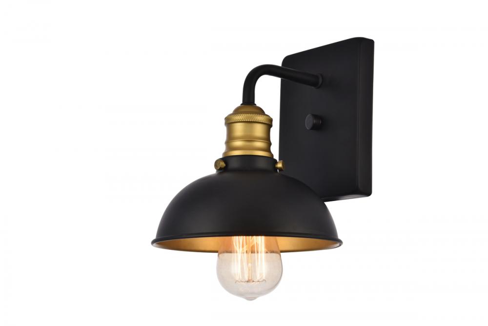 Create an industrial vintage look in your warehouse-inspired space with the striking Anders collection. The wall sconce features one to three Black bell-shaped shades with a Black and brass finish. A Metal arm connects one to three lights (Not included) to a sleek, Black Metal panel, providing a stunning contrast to the concentric brass detailing. This fixture will enhance the modern décor of your kitchen, bedroom, bathroom, study, or hallway.