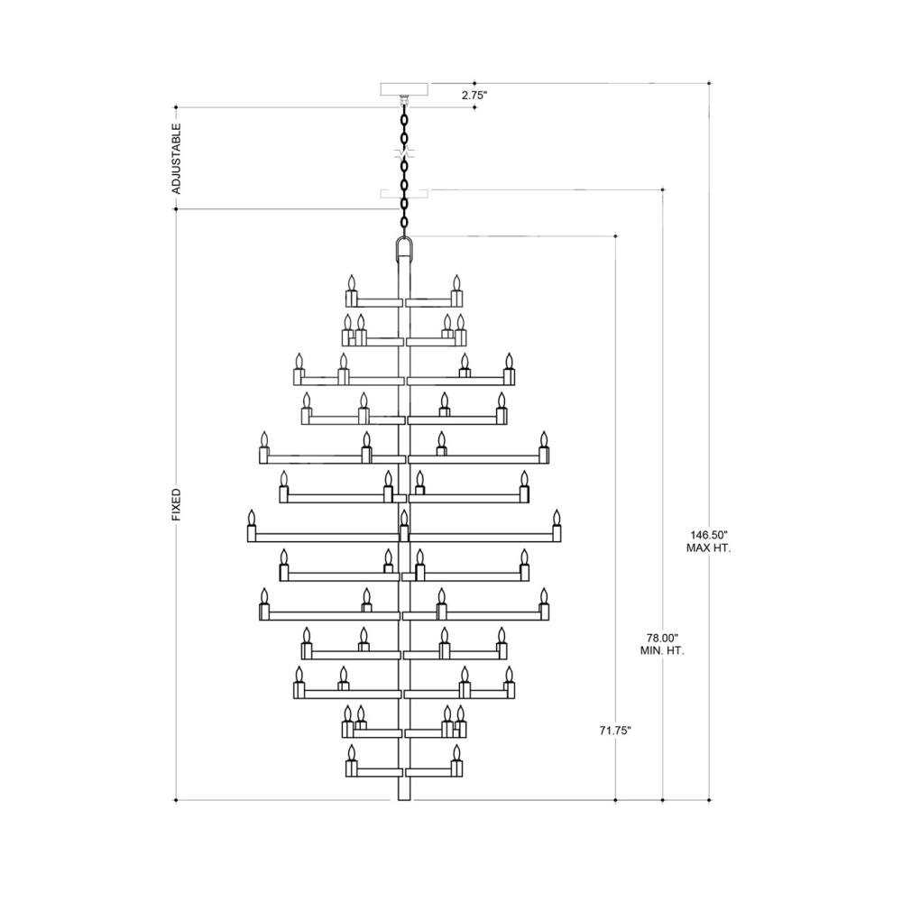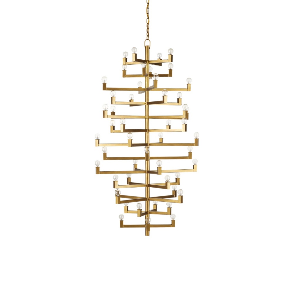 Clean articulated arms with resolute geometries make the big, bold Andre Grande Chandelier a powerful statement that can easily swing from contemporary to transitional styles, and many in between. Made of wrought iron in a brass finish, the gold chandelier will take on other personalities when the shapes of the bulbs are changed. Tall foyers and great rooms with high ceilings are perfect spots for this luminous modern light fixture with a stunning 52 lights. Adjustable from 78" to 169" with use of included chain/rod kit/cable. If your space calls for a longer drop, additional chain/rods/cable is available for purchase.