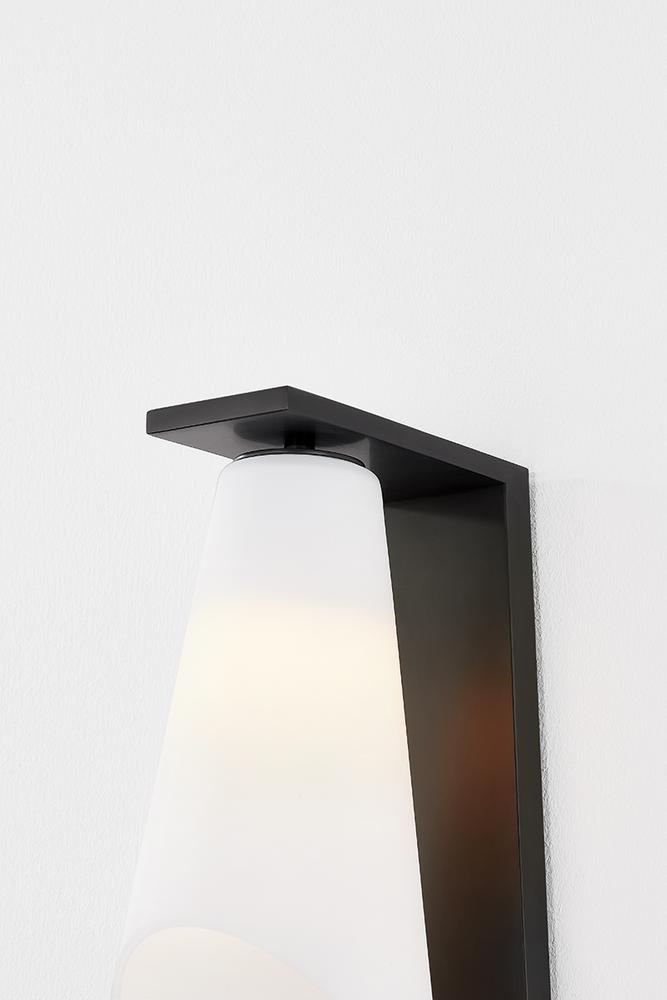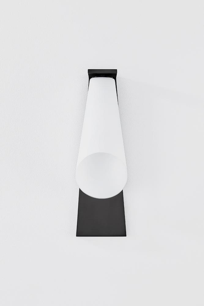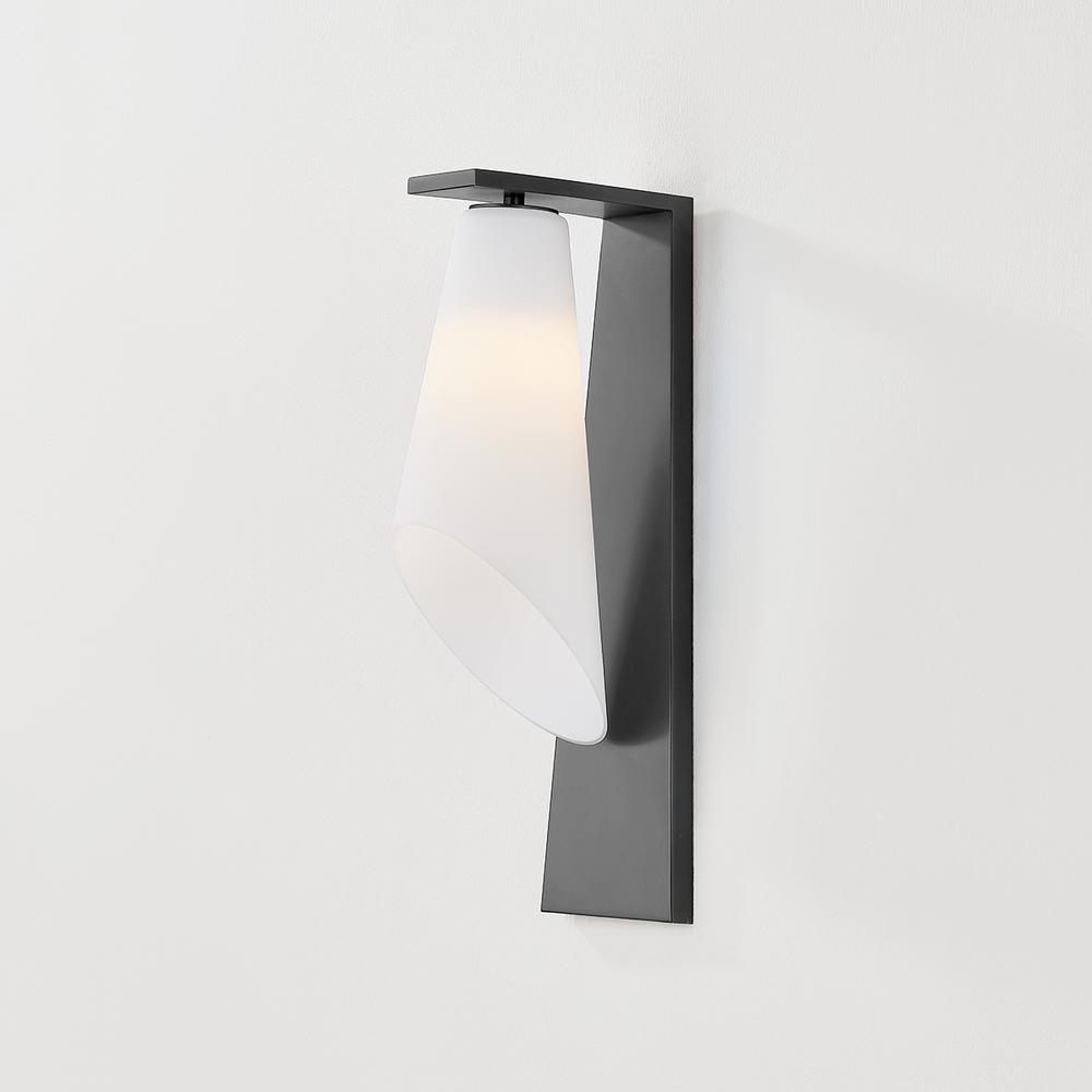 Sharp angles, sinuous curves, and sleek metalwork come together in the architectural Andros sconce. Suspended from an L-shaped backplate, the modern conical silhouette has a bell-like appearance. The opal matte glass shade is bias-cut on the end to create an elliptical opening, projecting light outwards into the room. Choose from either an Aged Brass or Old Bronze backplate for a more classic or modern look.