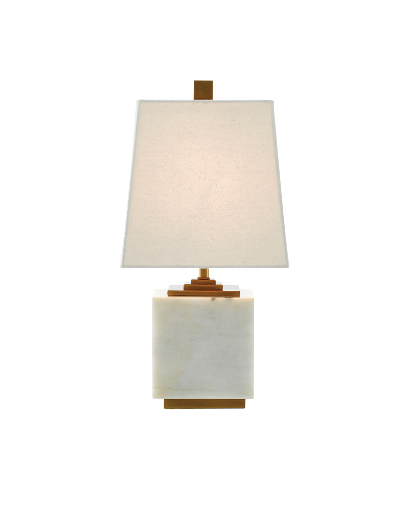 The Annelore Table Lamp is made from a block of white marble with stacked plates of metal above its body and a single-slab base below it. Along with the tall metal finial in an antique brass finish, these elements contrast the marble and the white linen shade. for a black version of this lamp, see our Mairin Table Lamp.