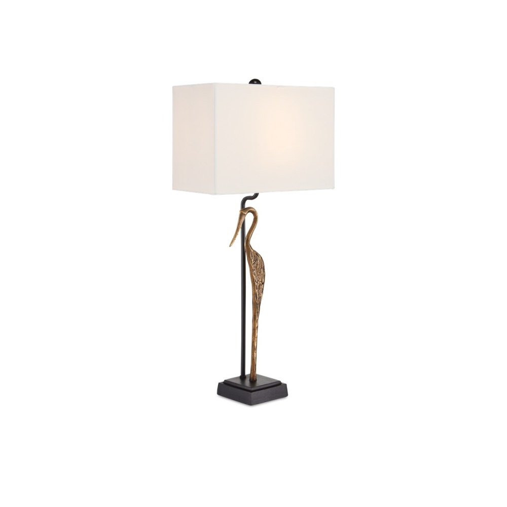 Looking as serene as a contemplative Greek princess from antiquity, the abstracted profile of the wading bird on the Antigone Table Lamp makes it a perfect choice for adding a bit of whimsy to a room. Made of cast aluminum in a mix of antique brass and black finishes, the svelte, long-billed bird is perched atop a black painted, cast aluminum base. The inspiration for this gold table lamp was a sculpture with the same lithe silhouette.