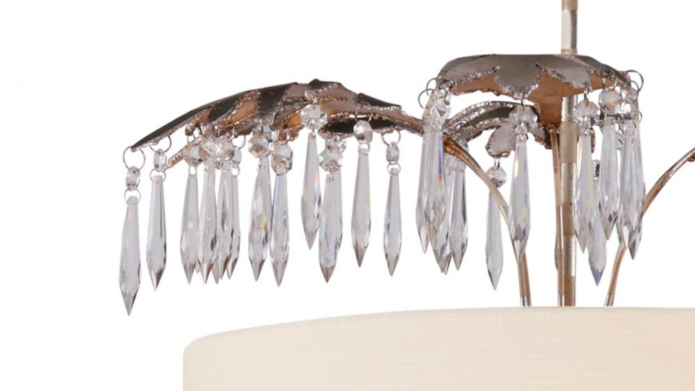 Antoinette Chandelier: cream linen shade with cut glass crystals and sculpted bobeches. A shabby chic favourite, it adds sophistication to kitchens or decor. This shaded beauty draws eyes everywhere.