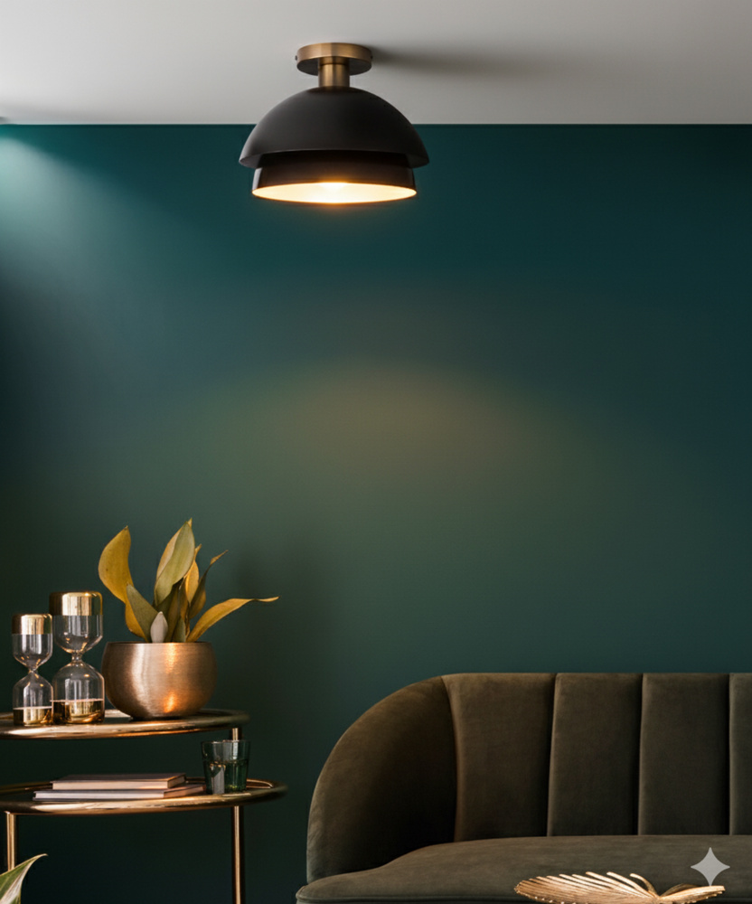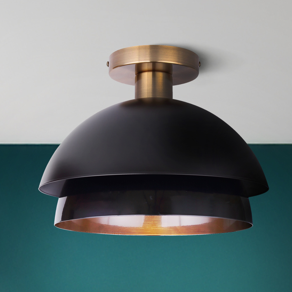 The ANYA semi-flush mount ceiling light brings bold, modern style with a refined vintage influence. Its matte black outer shade contrasts beautifully with a glossy black inner finish and warm gold base, creating a postmodern look that feels striking yet versatile. At 11.62 inches wide, this single-light ceiling fixture is ideal for small to medium spaces, such as bathrooms, bedrooms, or entryways. Designed for a single 60W Type A bulb, it delivers balanced illumination while acting as a stylish focal point. Damp-rated for safe use in moisture-prone areas, ANYA is a modern semi-flush ceiling light that blends subtle luxury with contemporary edge.
