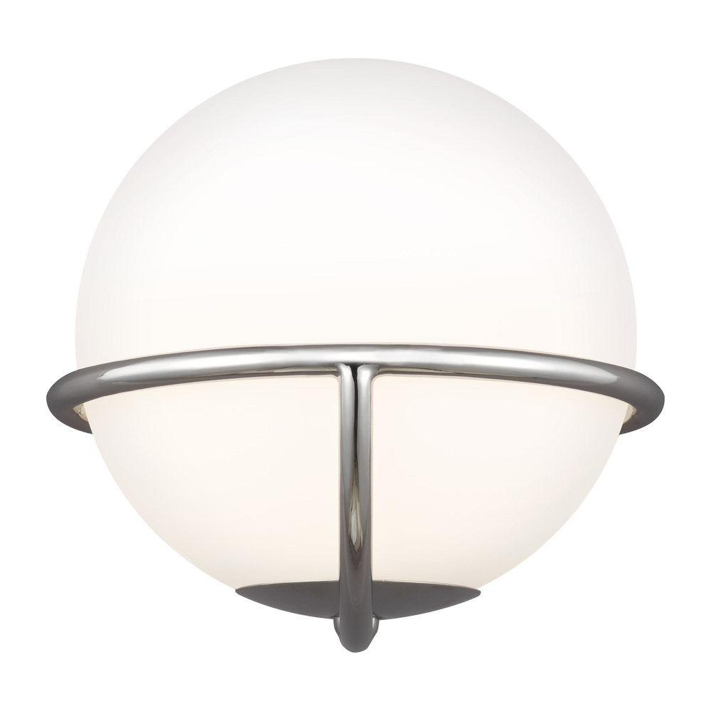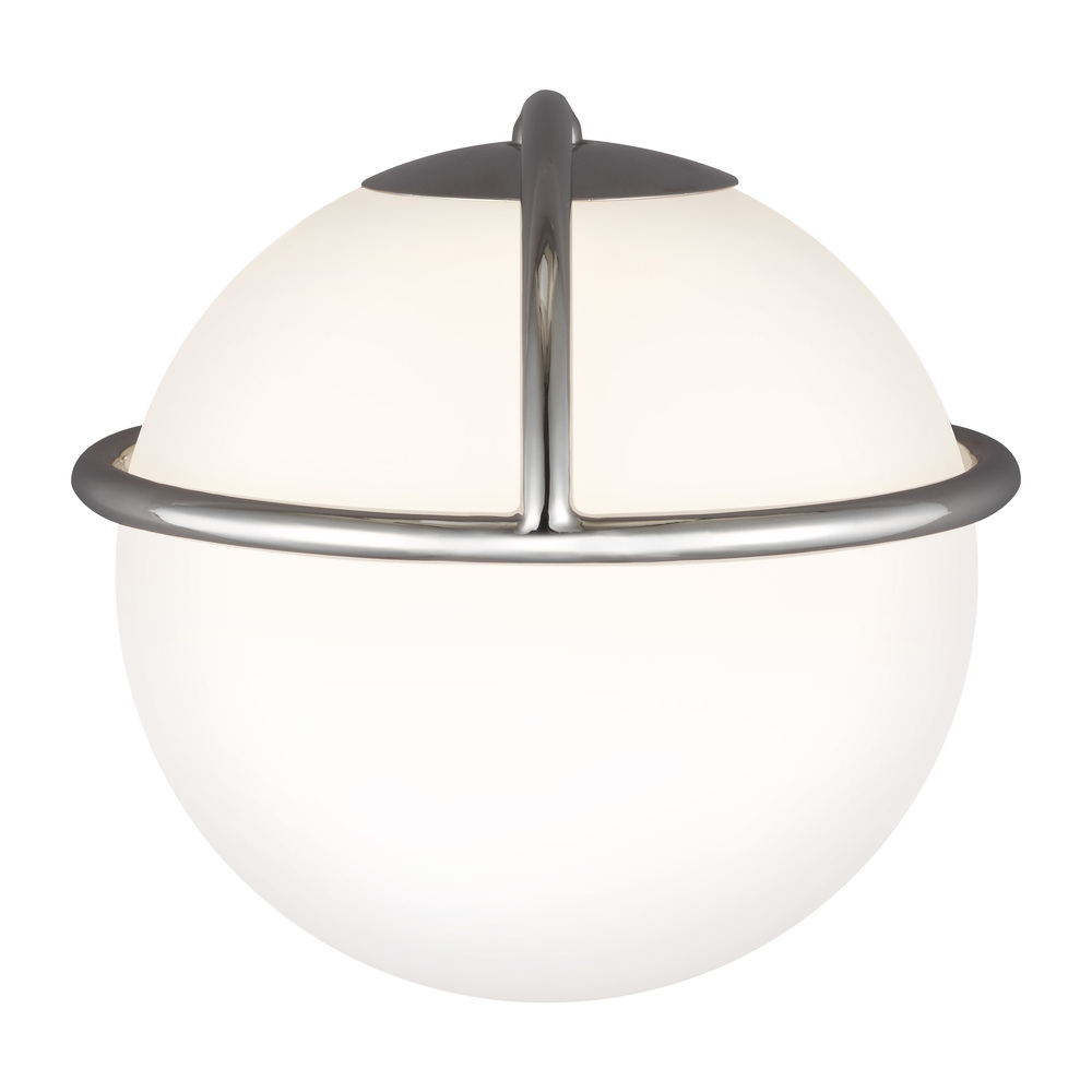 The modernist Apollo impresses with perfectly balanced White Opal Etched Glass globes that gently rest within a spherical Burnished Brass or Polished Nickel frame. Apollo's cosmic appeal and artistic mid-century design is sure to become the focal point of any space.