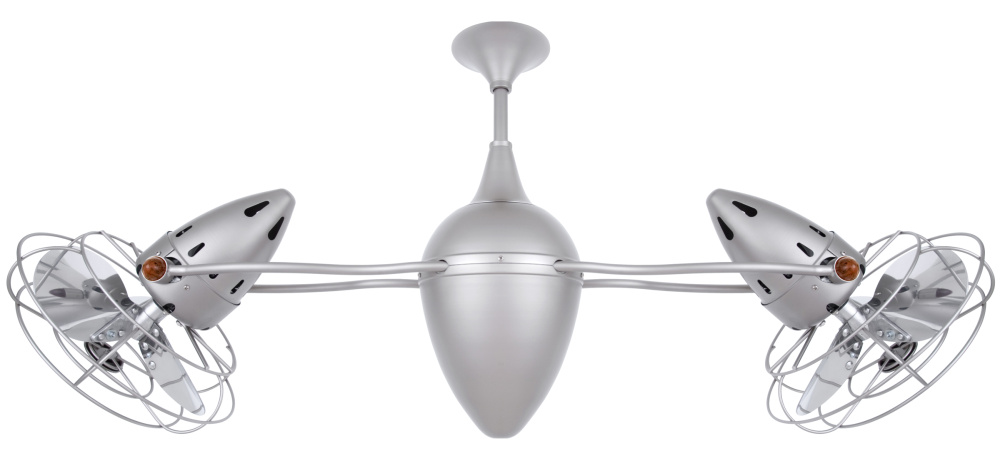 The Ar Ruthiane's unique hourglass support arms grasp bullet-shaped motor housings which rotate about its teardrop center. The fan heads can be infinitely positioned in 180-degree arcs for optimum air movement; the greater the angles of the motors to the horizontal support rods (up or down), the faster the axial rotation. A slow, controlled axial rotation is achieved by both fan head position and fan blade speed.