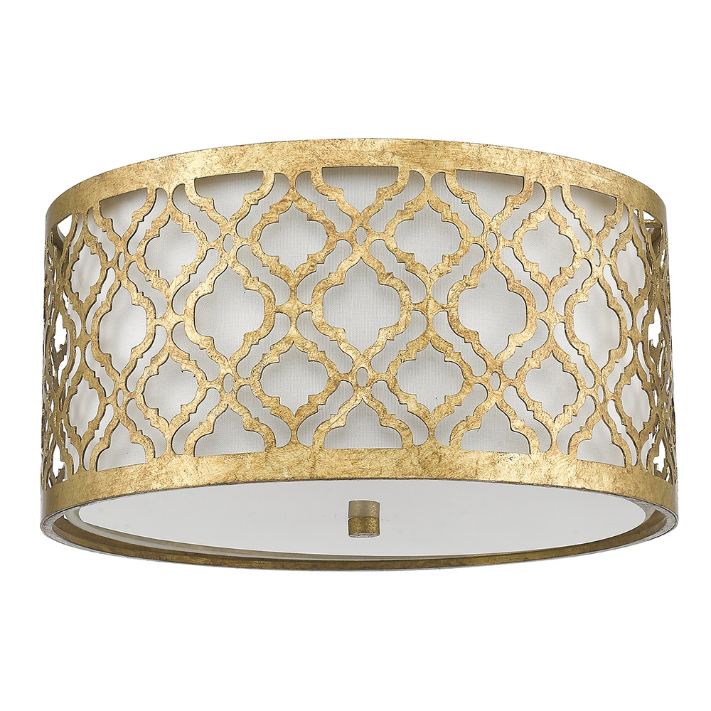 A chic 16" dia., 8" high flush mount in distressed gold. Its cream linen shade and glass diffuser soften light from two 75W bulbs, perfect for any room. The outer metal shade adds vintage charm and stylish ambiance.