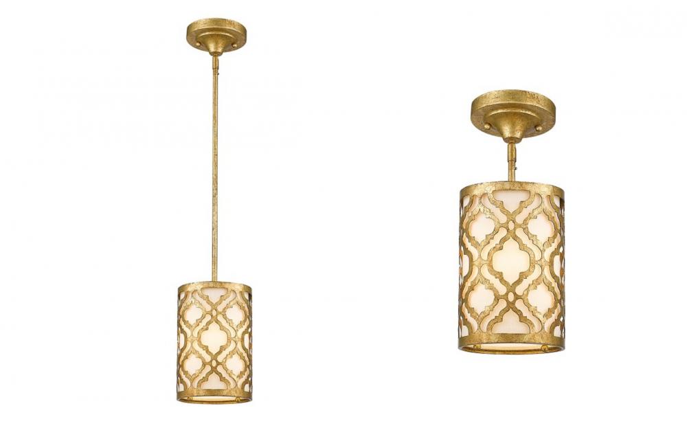 A chic mini pendant in distressed gold with a trellis outer shade and fabric drum inner. Convertible to semi-flush, it uses one bulb for adjustable ambiance. Perfect for kitchens, blending vintage style with modern flair.