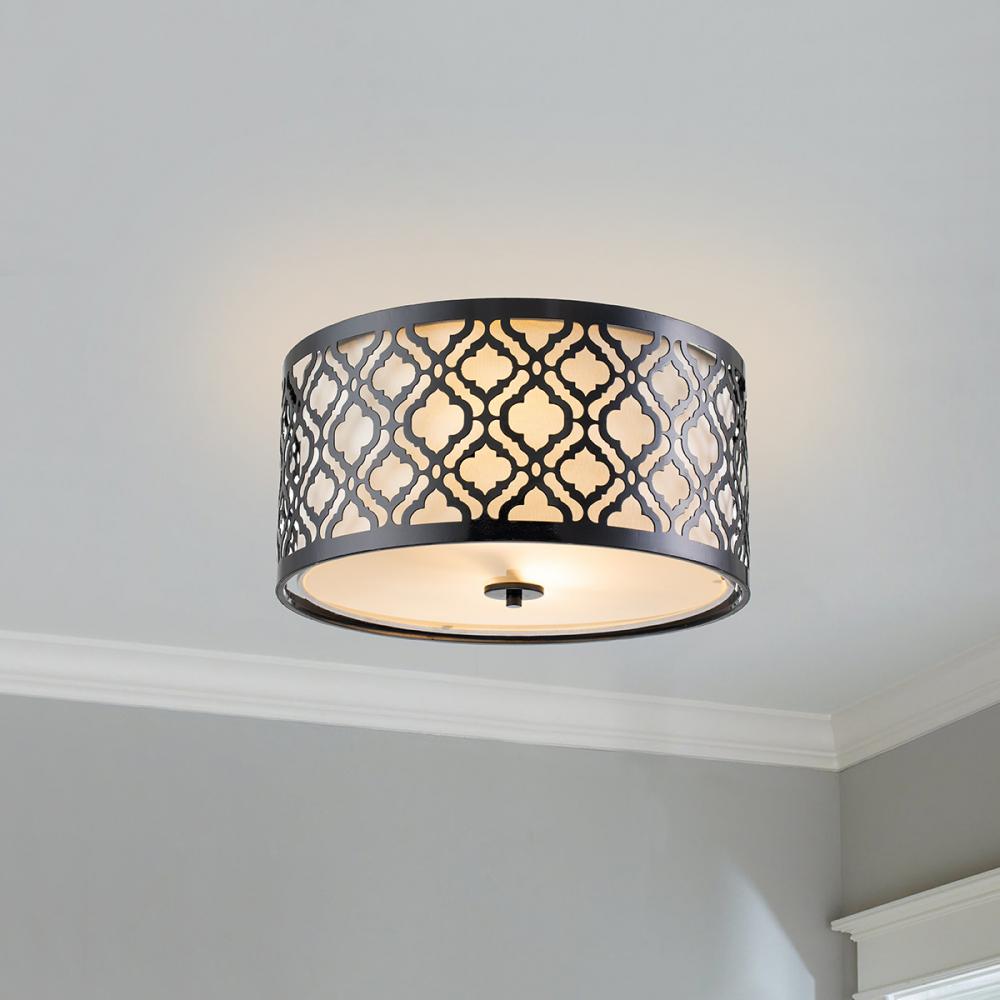 A sleek 16" dia., 8" high flush mount in black. With a cream linen shade and glass diffuser, it softens two 75W bulbs’ light. This vintage-inspired piece brings charming ambiance to any room with a modern edge.