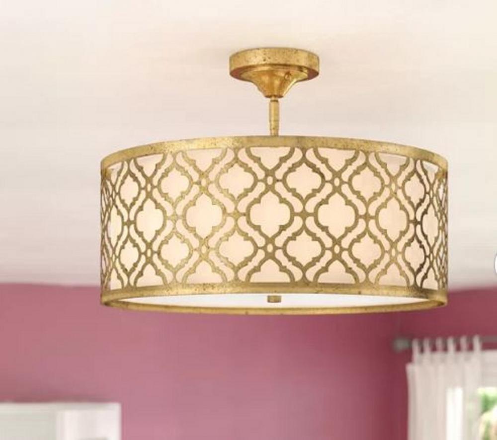 A stylish 52" adjustable pendant in distressed gold. With a trellis shade, cream linen inner, and diffuser, it converts to semi-flush. Perfect for hallways or tables, it blends sophistication with charming light.