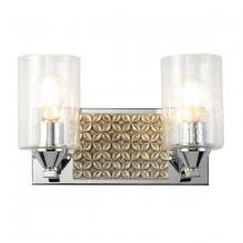 A 13" x 8" x 6.5" 2-light vanity in matte black and antique gold with a textured backplate and cylinder seeded glass. Adds Arcadia-inspired texture to bathrooms.