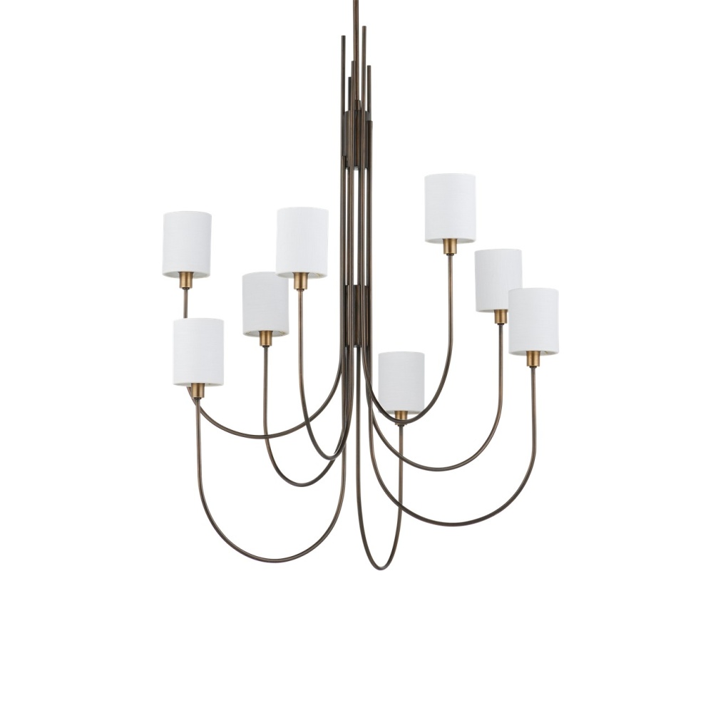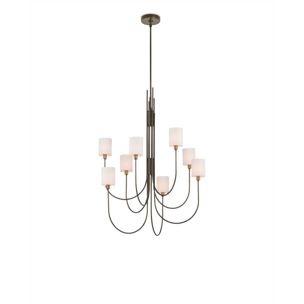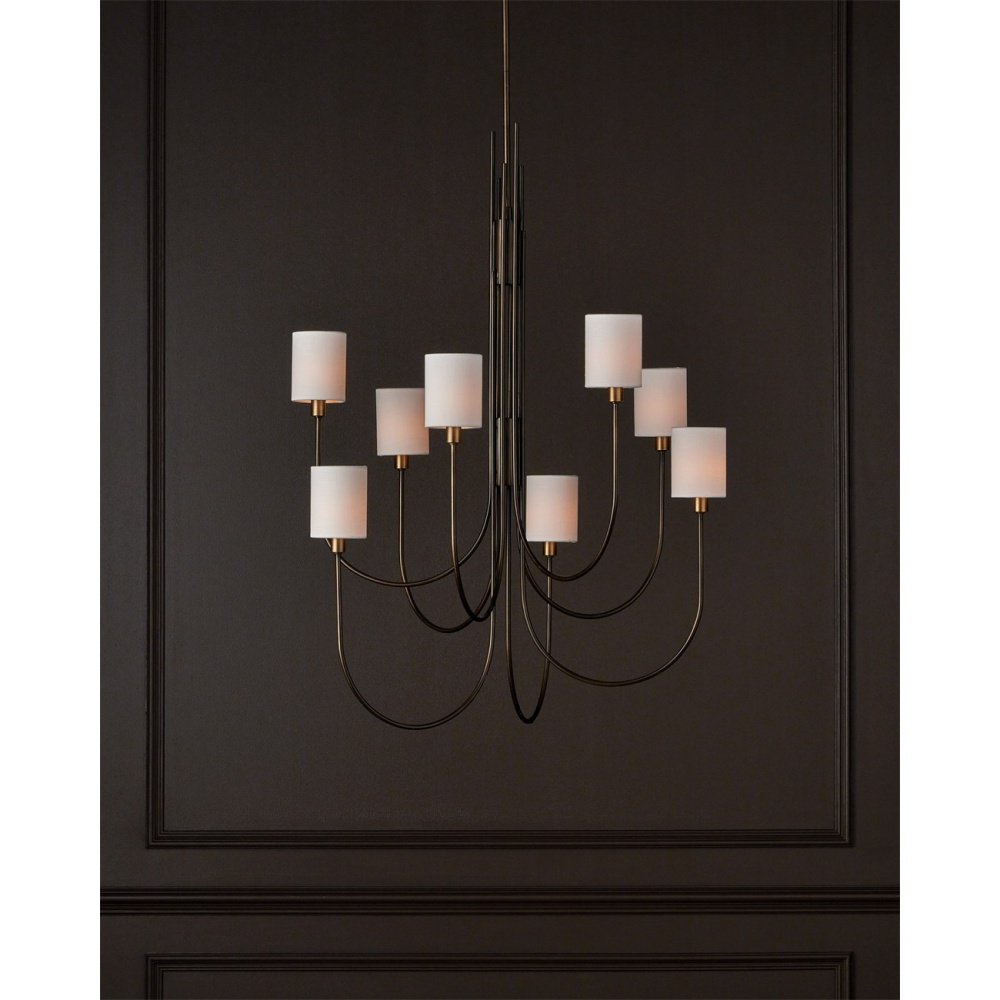 The Archetype Chandelier has a beautifully arcing form. The design details that make it special include the staggered curving lines of the thin pieces of metal at the bottom and the graduating placement of the straight ends as they attach to the stem. The Statuary Bronze finish is also a sophisticated design detail, as is the fact that the bobeches are finished in brass. The off-white linen shades sit directly on the bobeches and create a lovely glow. Adjustable from 52.25" to 94.25" with use of included chain/rod kit/cable. If your space calls for a longer drop, additional chain/rods/cable is available for purchase.