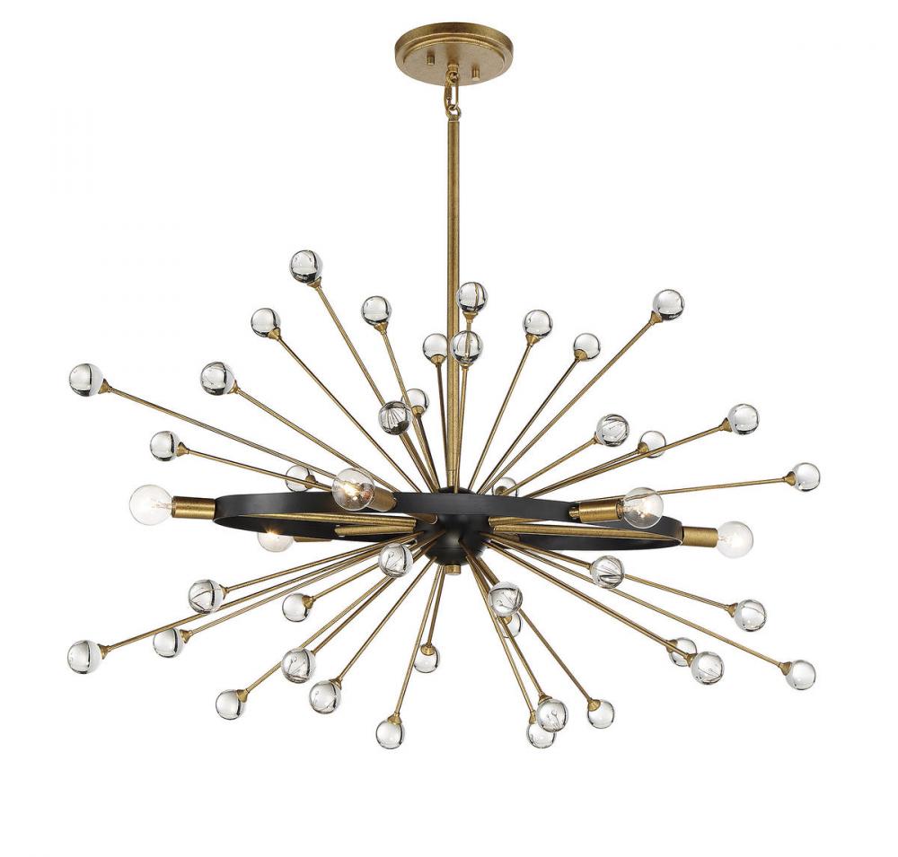 The Ariel 6-light linear chandelier from Savoy House offers a beautifully elegant and modern take on iconic Sputnik style. Slender Gold-finished arms topped with bulbs and crystal baubles emanate from a central sphere orbited by a ring finished in Como Black. Ariel is 37" in length, 18" in width and has an adjustable height ranging from 27" to 73". It uses six candelabra size bulbs of up to 60 watts max per bulb. Comes with four 12" downrods and one 6" downrod, plus 80" of chain.