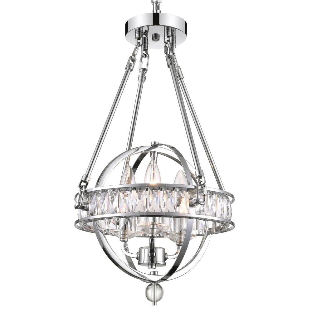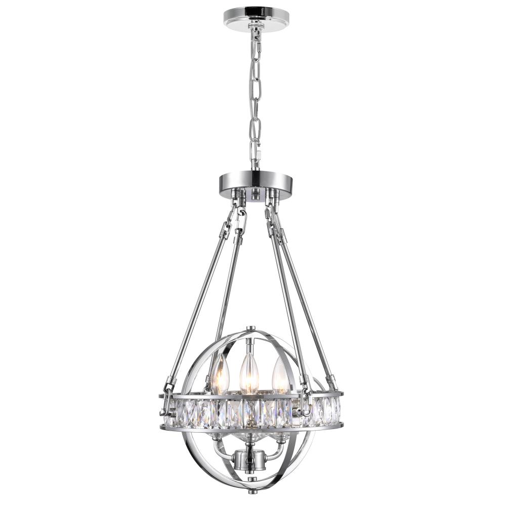 Make a bold style statement with the Arkansas 12" Chrome Mini Chandelier. This orbital-shaped light fixture features an open metal frame adorned with a band of faceted crystals for a touch of sparkle. Perfect for bedrooms, bathrooms, or entryways, this 3-light chandelier casts a warm glow through candle-style bulbs. Its chrome finish and compact silhouette bring modern charm and cozy elegance to any smaller space in need of a refined lighting upgrade. Finish: Chrome Fixture Width: 12" Light Count: 3 Bulb Base: E12 LED Compatible Style: Modern / Glam / Transitional Mount Type: Mini Chandelier