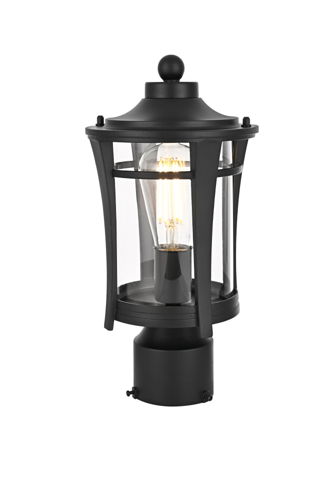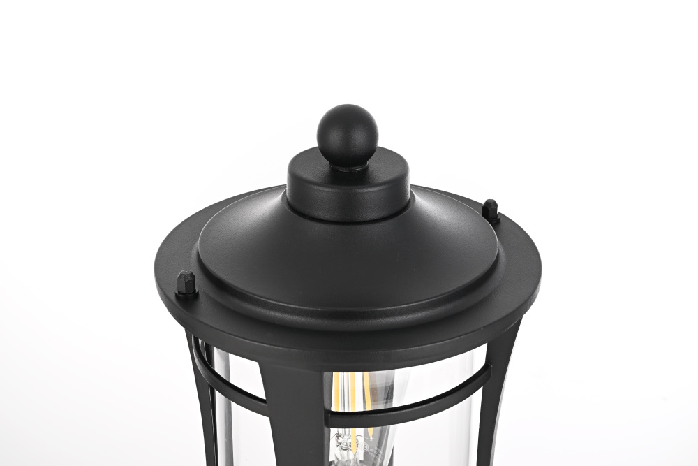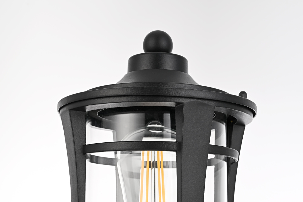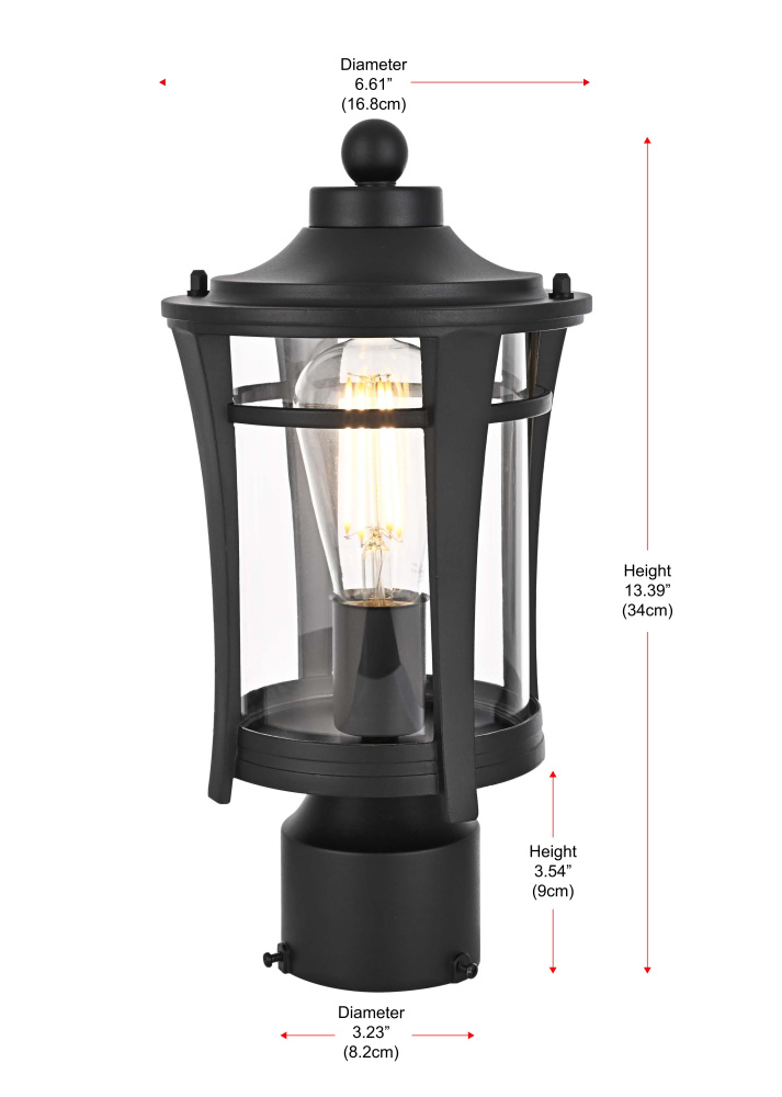 This post light blends traditional lantern styling with sturdy metal craftsmanship, featuring a curved frame, clear glass panels, and a decorative finial that give it a timeless presence. The rounded top and subtly arched supports create a balanced look that complements both classic and transitional outdoor spaces. Made from iron and aluminum, the durable black-finished frame ensures long-lasting performance. The clear glass panels provide full visibility of the bulb, enhancing brightness while maintaining a clean, structured appearance. Designed to fit most standard 3.23-inch post light poles (pole not included), this fixture is dimmable when paired with a compatible dimmer, allowing for adjustable brightness. ETL Wet Rated for reliable outdoor use, this post light is a sturdy and stylish addition to driveways, walkways, and landscaped areas. Built with marine-grade, corrosion-resistant aluminum, this sconce withstands coastal conditions for long-lasting durability.