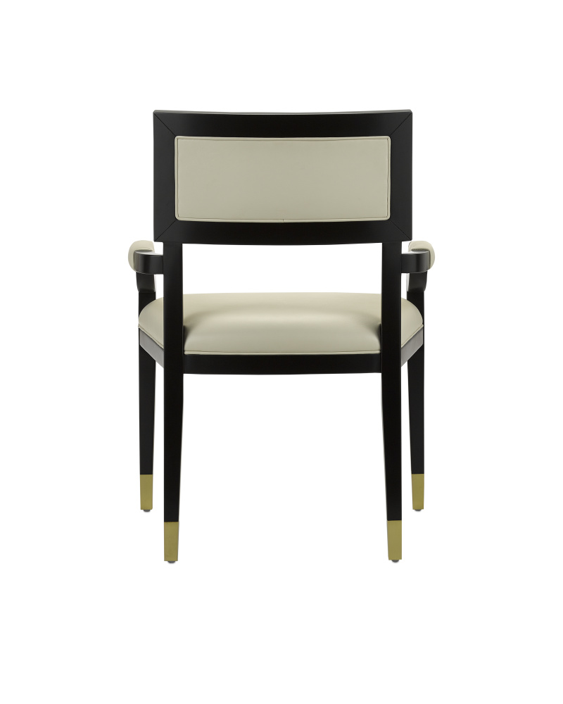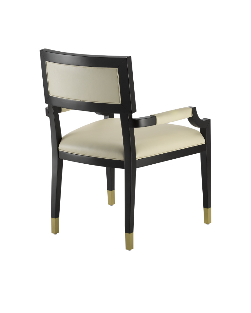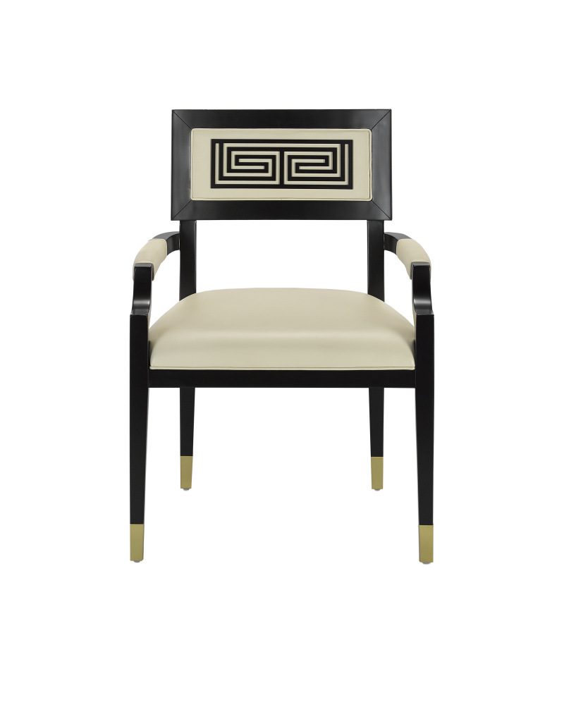 Barry Goralnick designed the Artemis Leather Armchair. with its Greek Key wood inlay in the inside back, leather on the outside back, and brass ferrules, the chair is an update on the classic Klismos chair. Most Klismos chairs are more known for their look than comfort. This chair is designed for comfort first, with modern proportions that include a wider, deeper seat. Made of Beech wood in a caviar black finish, the dark brown chair has a tailored feel with its milk leather upholstery.