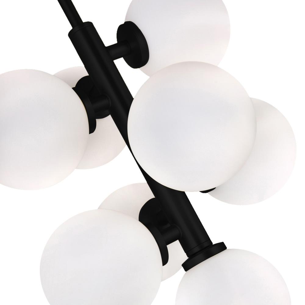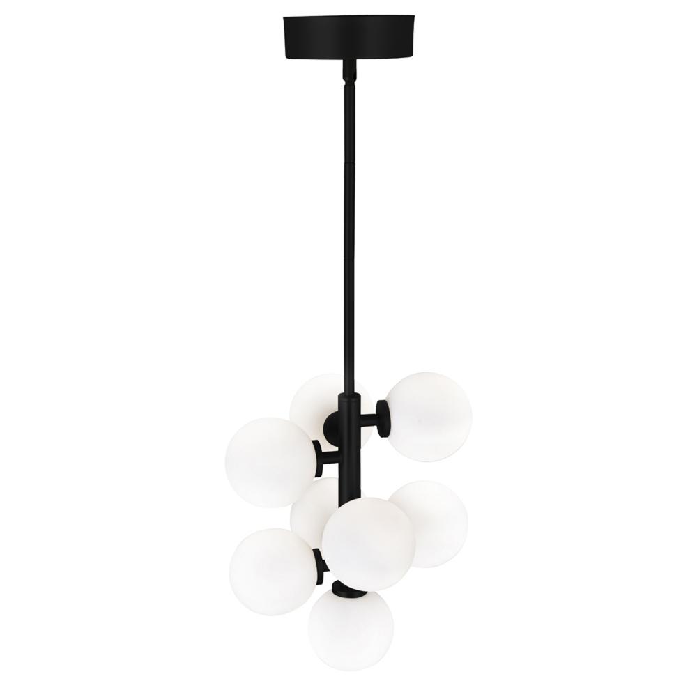 Modern Statement Fixture: 12-inch black pendant with eight frosted glass globes for a clean, chic silhouette
