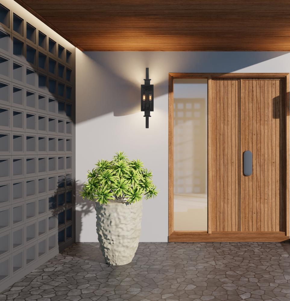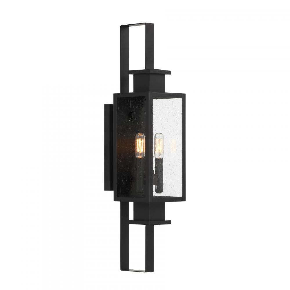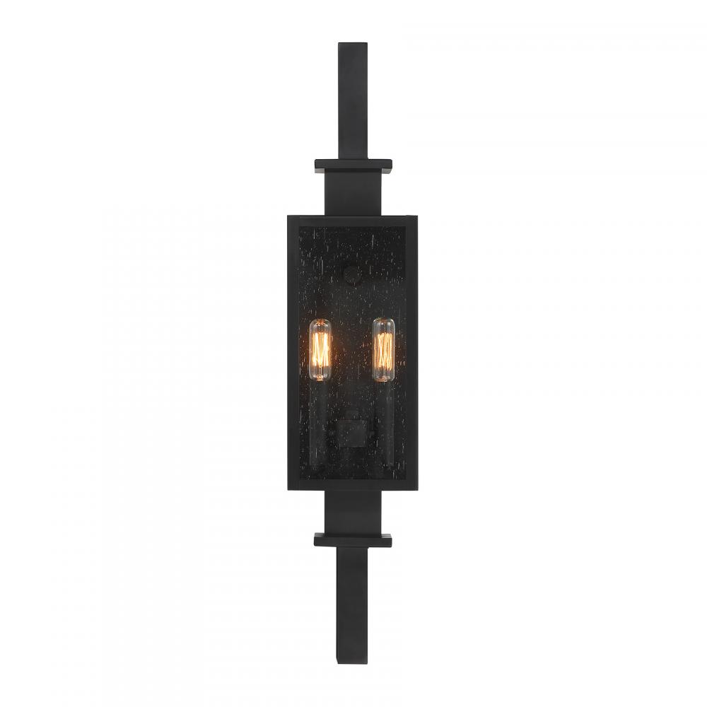 The Savoy House Ascott 2-light outdoor wall lantern is a standout source of cool contemporary lighting style for great first impressions. Sleek and slender, Ascott features center-mounted lights inside panes of clear seeded glass in a sharply angled frame. Matte Black finish. Ascott is 26.75" in height, 5.5" in width and extends 7.5" from the wall. Uses two candelabra size bulbs of up to 60 watts per bulb. Bulbs not included. Wet area rated.