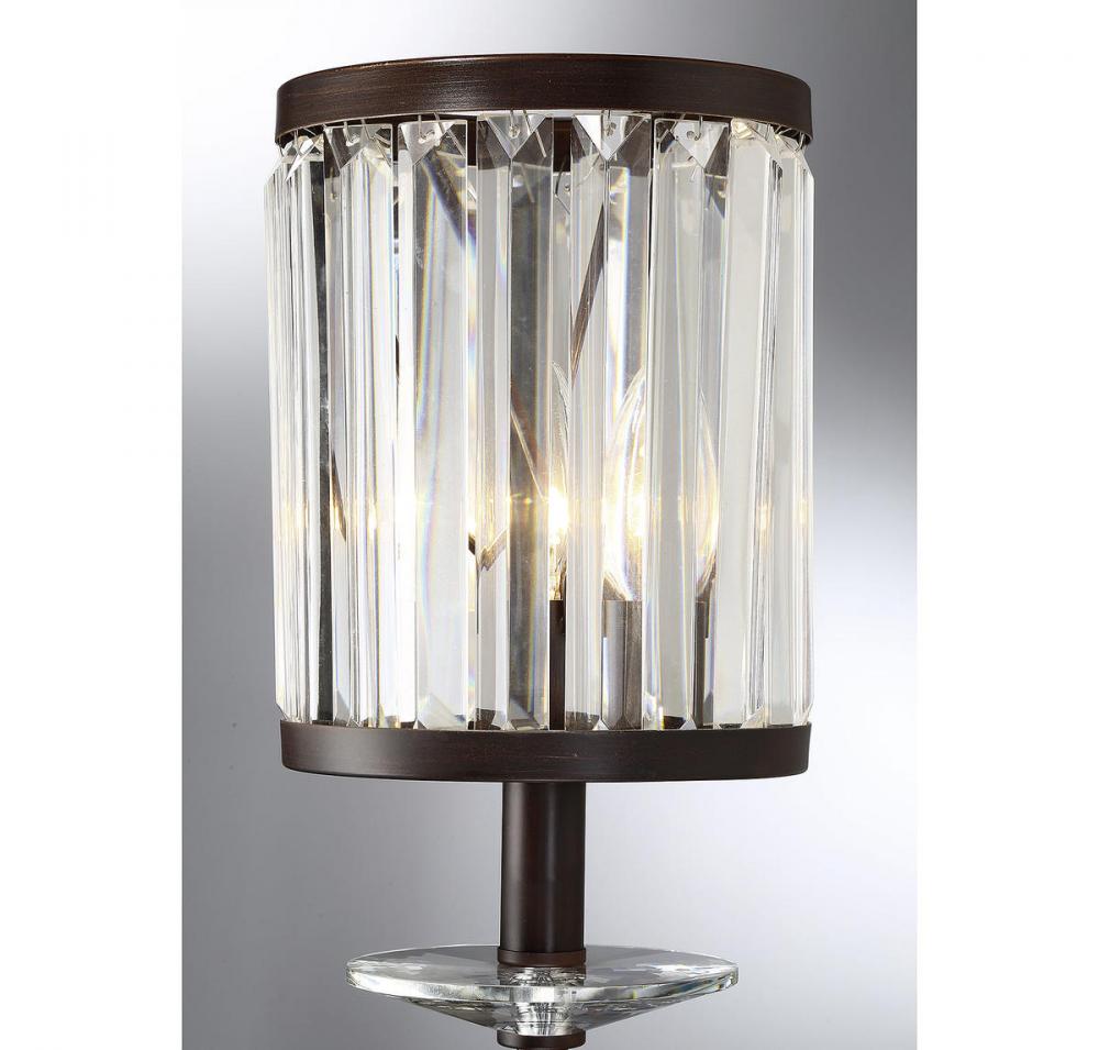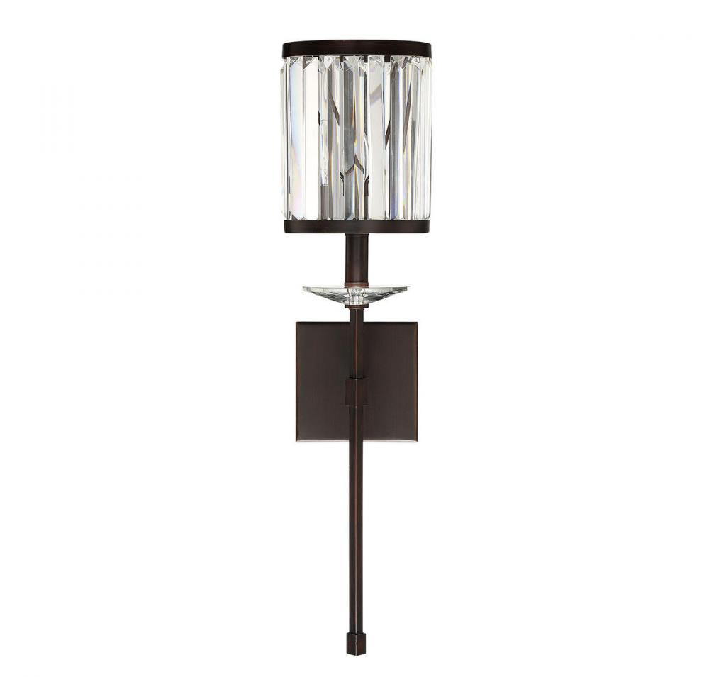 In the Savoy House Ashbourne, contemporary styling meets traditional materials for a wall sconce that’s right at home in your transitional or traditional decor. The light arm, wall plate and rims of the frame have a rich Mohican bronze finish. The frame is lined with beautiful rectangular clear crystals and there’s a decorative crystal just below the lamp too. One 60W candelabra size bulb within provides lovely illumination filtered through the crystals. The Ashbourne sconce is 6.5" wide, 26" high and extends 8" from the wall, making it a perfect size for your dining area, living room, entryway, great room, bedroom, bathroom, hallway, office, family room or stairway.