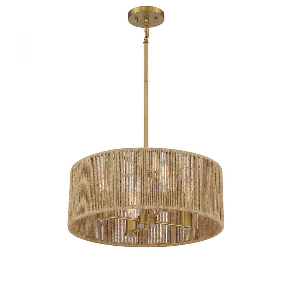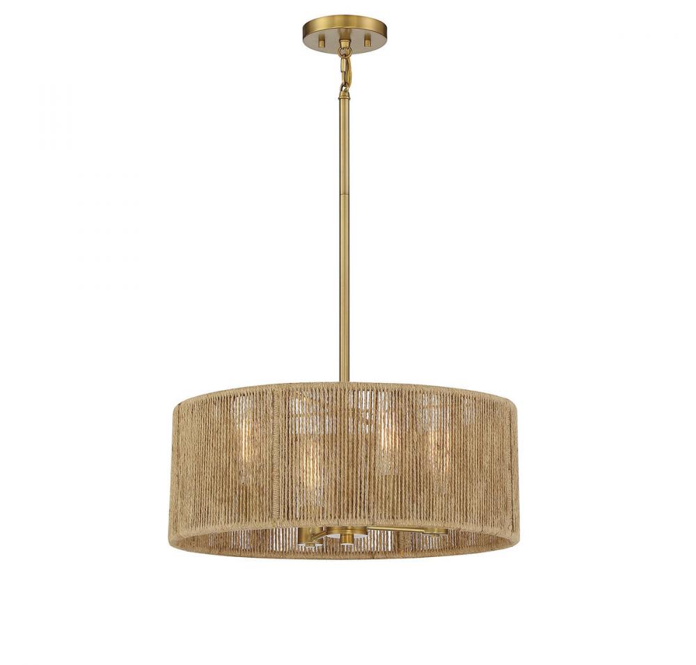 This Savoy House Ashe 4-light pendant has a warm, organic design. Its drum shade is strung with rows of textured rope, allowing light to shine through and providing a stylish look even when the lights are off. Finished in warm brass. Ashe is 20" in width and has an adjustable height ranging from 14" to 60". It uses four standard size bulbs with a max of 60 watts per bulb. Comes with four 12" downrods and one 6" downrod, plus 80" of cord.