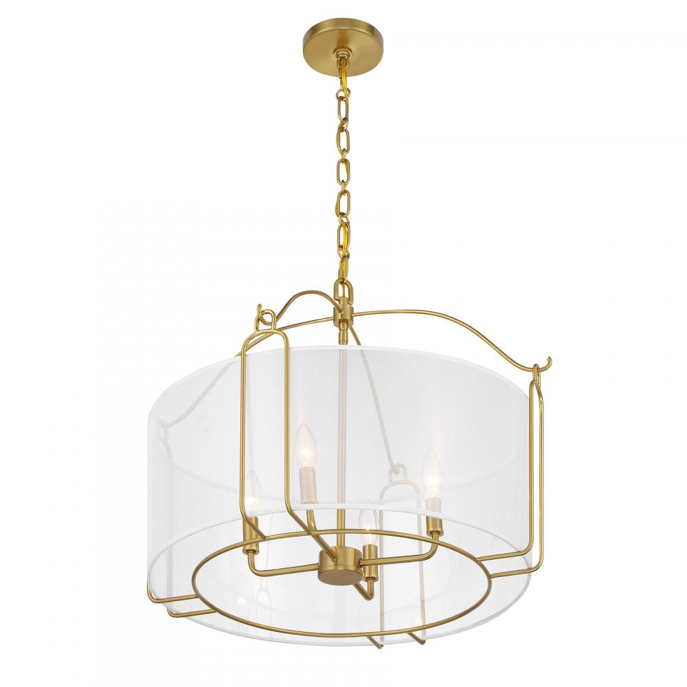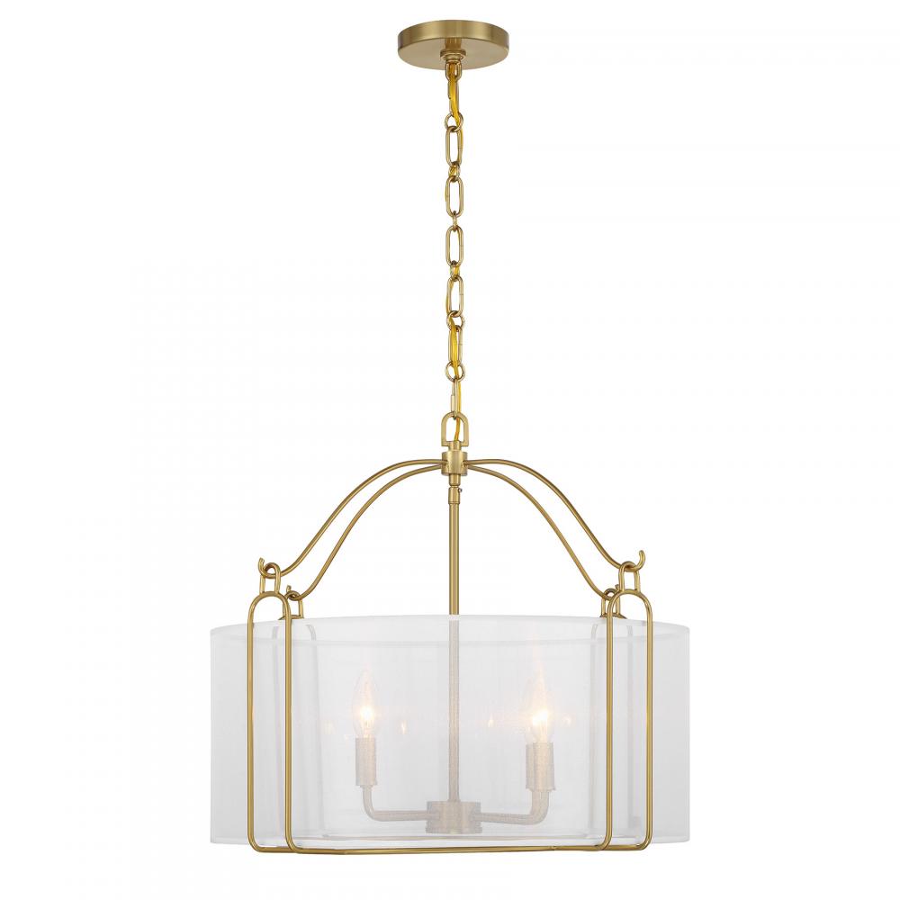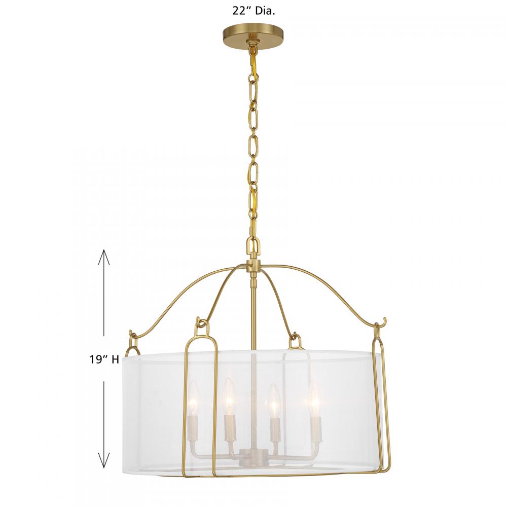Create a soft and subtle glow with the Savoy House Ashlay 4-light pendant. Its drum shade of delicate organza is held in place on sleek and curving arms finished in Warm Brass. Ashlay is 19" in height and 22" in width. Uses four candelabra size bulbs of up to 60 watts per bulb. Bulbs not included. Comes with 120" of chain.