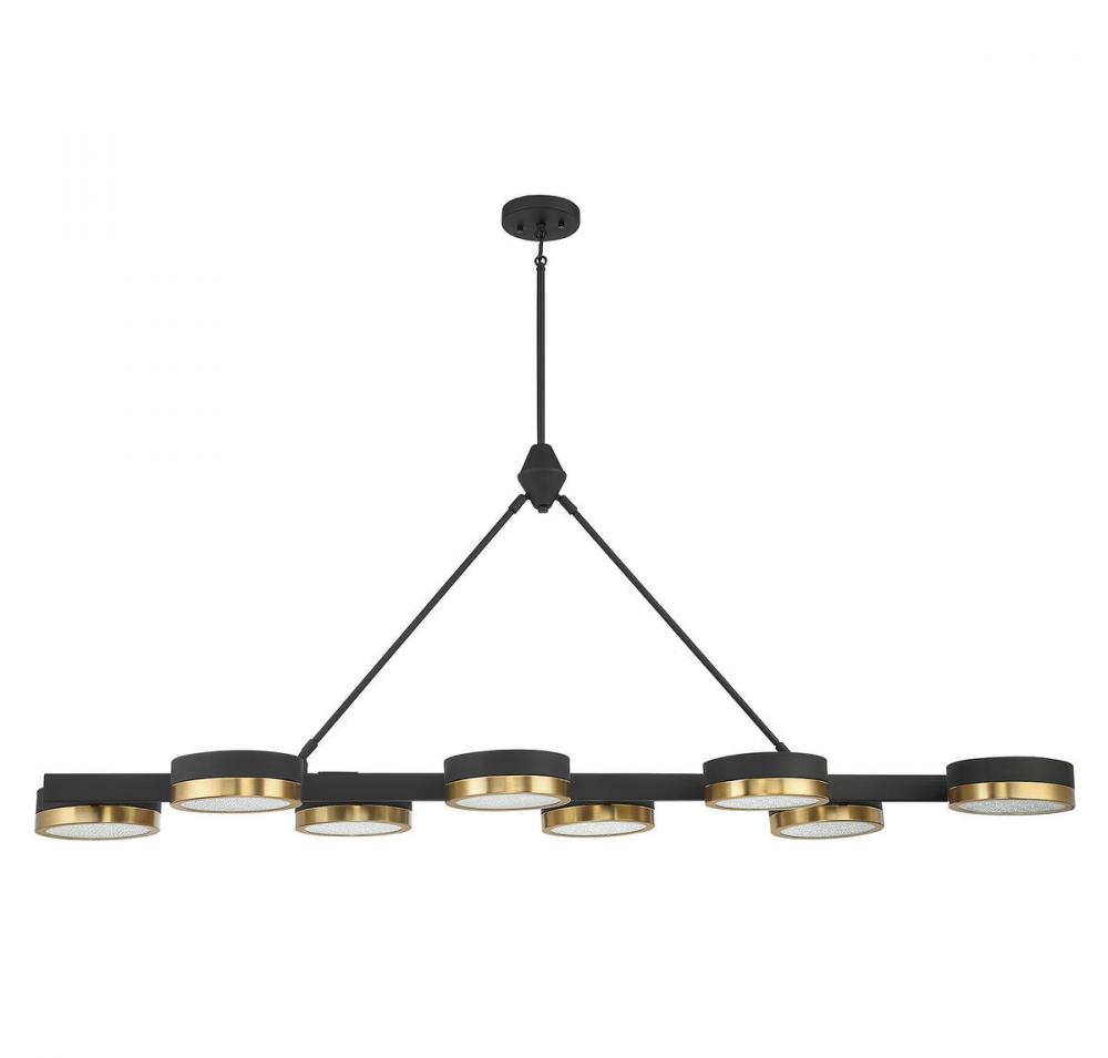 Substantial in size and style, the Savoy House Ashor 8-light linear chandelier is designed to beautify large spaces with its geometric look and two-tone finish. Sparkling faceted crushed crystal inside each light, illuminated by integrated LED, will truly wow anyone who sees it. Ashor is 60" in length, 18" in width and has an adjustable height ranging from 29" to 75". Comes with four 12" downrods and one 6" downrod, plus 80" of cord.