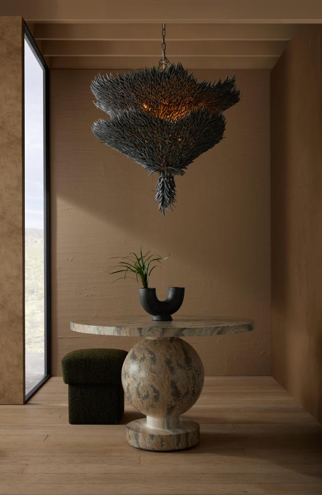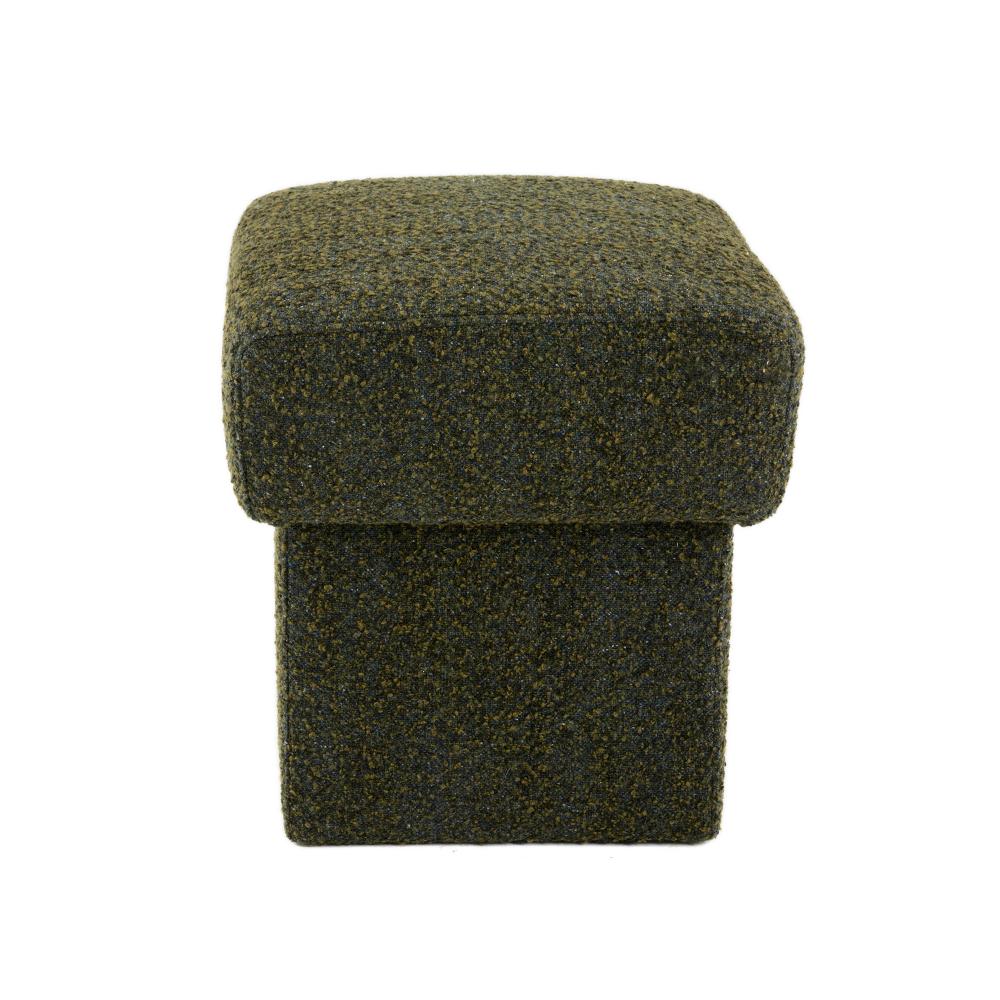 This mushroom-shaped stool is a delightful pop of color and texture. A well-padded seat of olive bouclé rests atop a matching base.