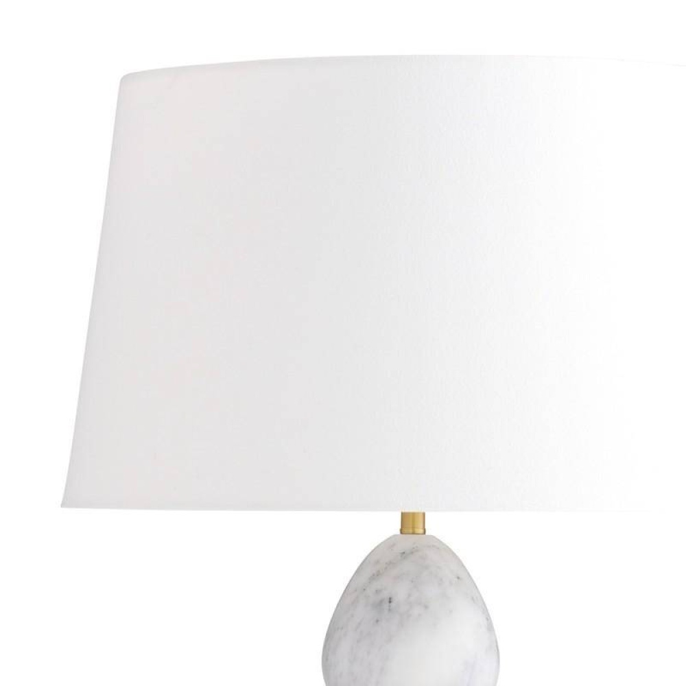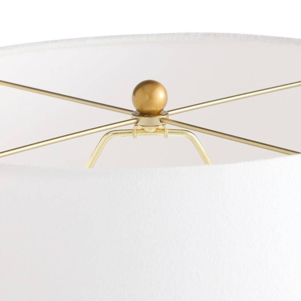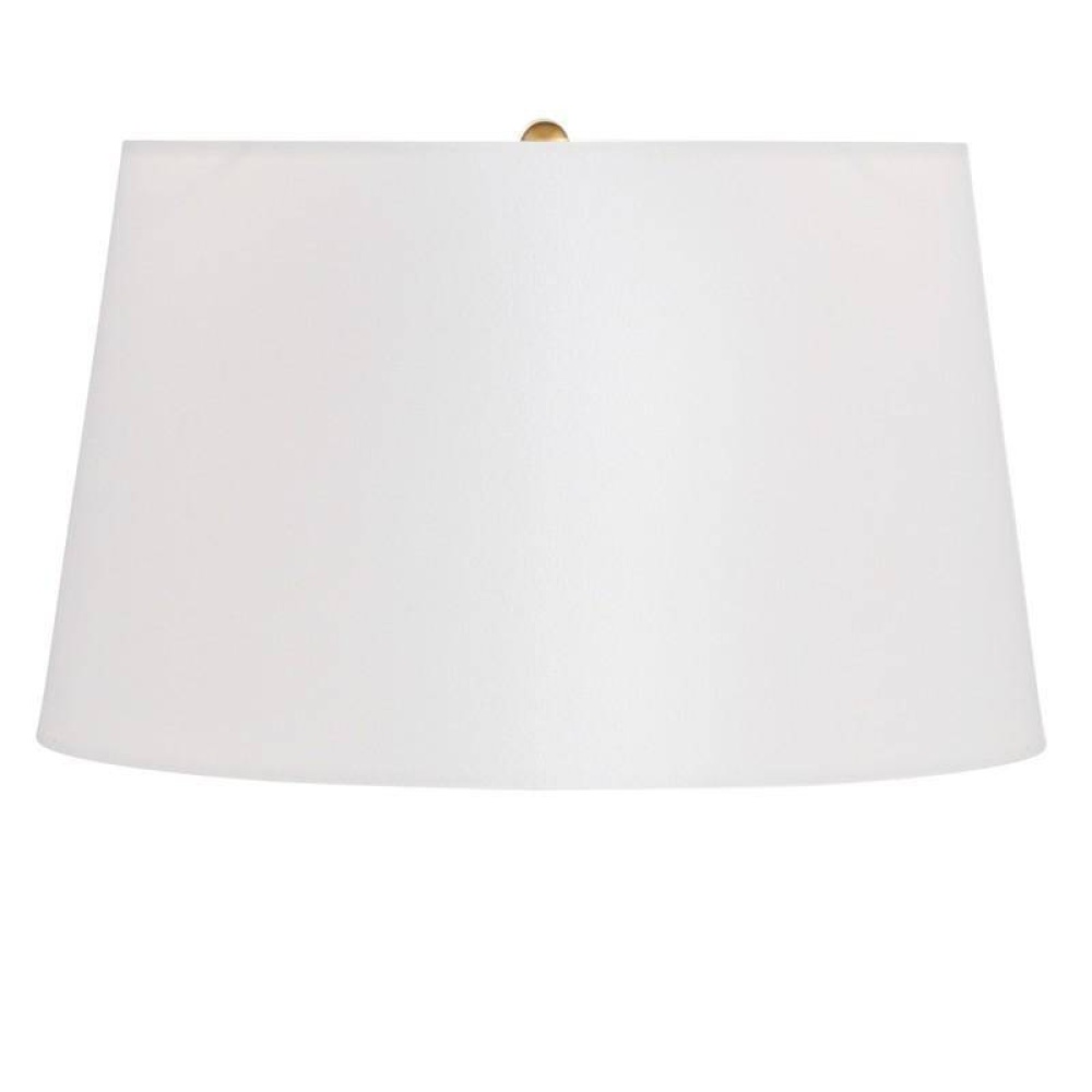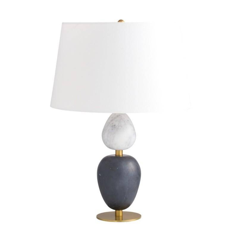 Defined by architectural elements and natural materials, the Aubrey is a showpiece. Even more so in our new combination of gray flower and black marble. Ovoid forms elevate the sleek frame of antique brass-plated steel and matching rounded base. Topped with an off-white linen shade lined in off-white cotton and an antique brass steel sphere finial. Finish will vary.