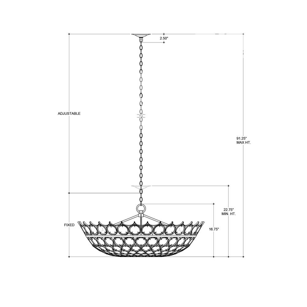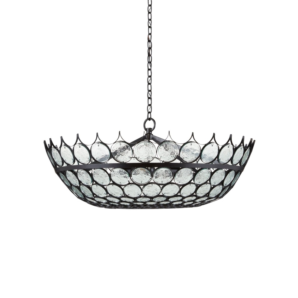 Recycled glass discs are encased in wrought iron in a satin black finish to bring the Augustus Chandelier great aesthetic strength. Design details of note are how unobtrusively the discs are fastened to the frame, the commanding size of the glass chandelier, and the fact that the discs grow smaller as they descend to the bottom of the shade. Adjustable from 22.75" to 91.25" with use of included chain/rod kit/cable. If your space calls for a longer drop, additional chain/rods/cable is available for purchase.